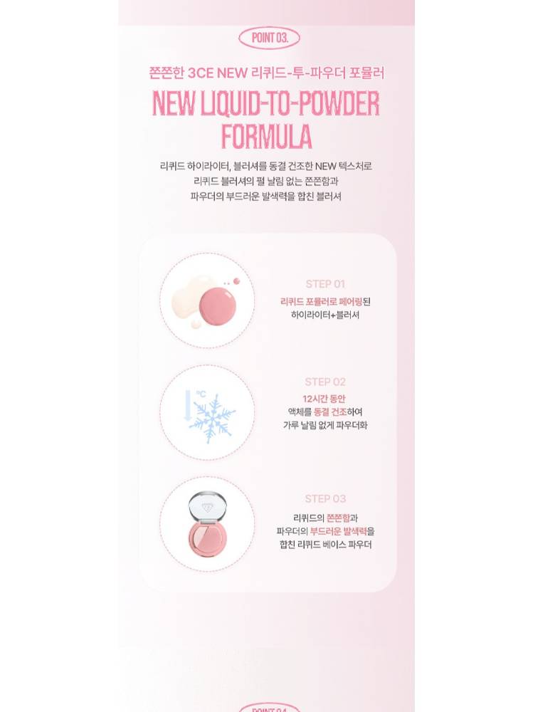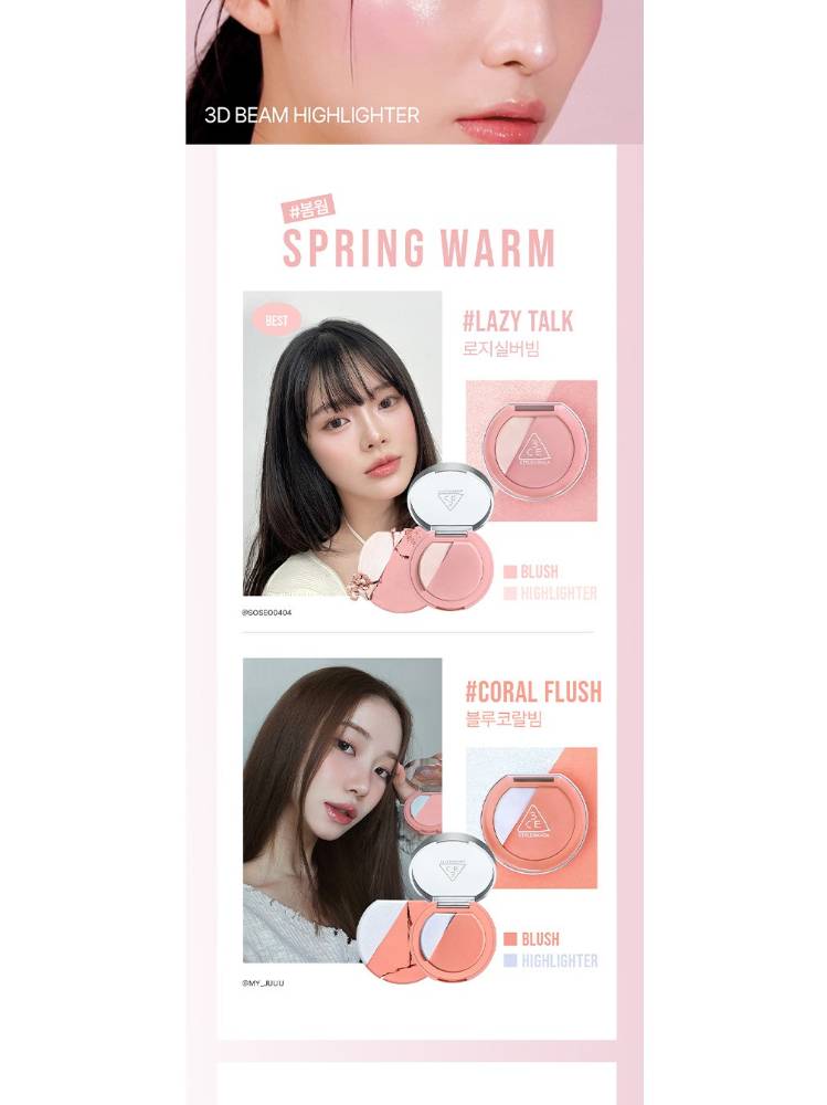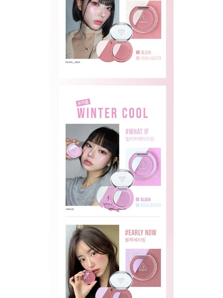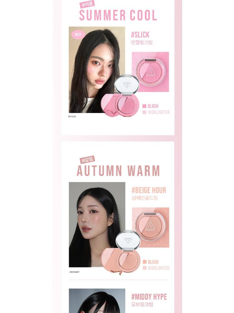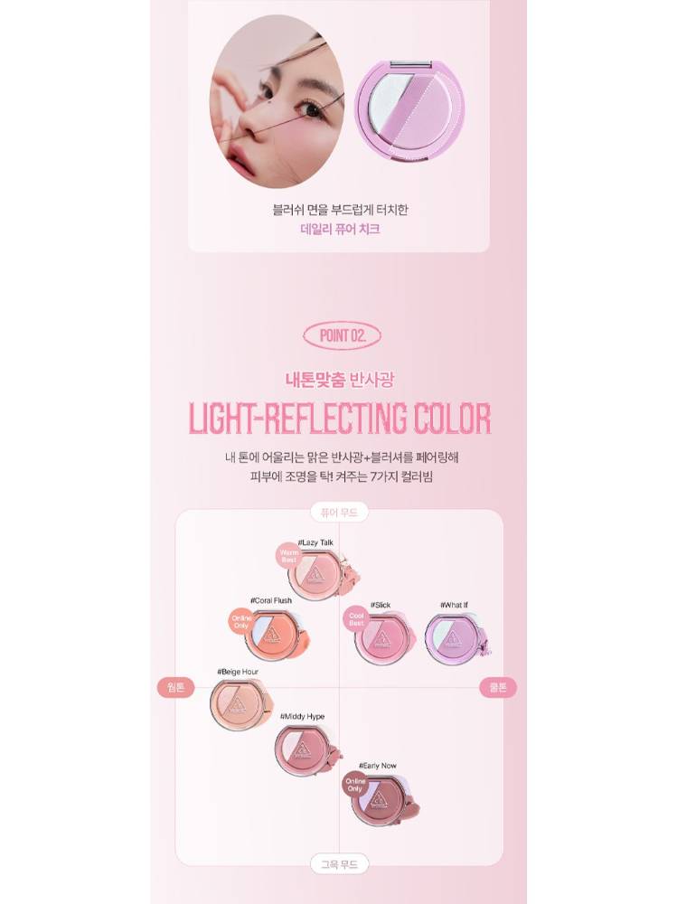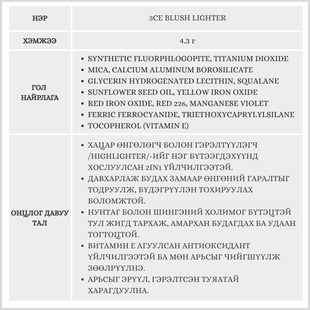 3CE Blush Lighter нь хацар өнгөлөх болон нүүрний өндөрлөгийг гэрэлтүүлэх хоёр үйлчилгээг нэгтгэсэн, давхарлаж будалт хийх боломжтой хацар өнгөлөгч юм. Арьсыг эрүүл, гэрэлтсэн туяатай харагдуулах ба давхар арьсыг чийгшүүлж, зөөлрүүлнэ. Багс дагалдана.