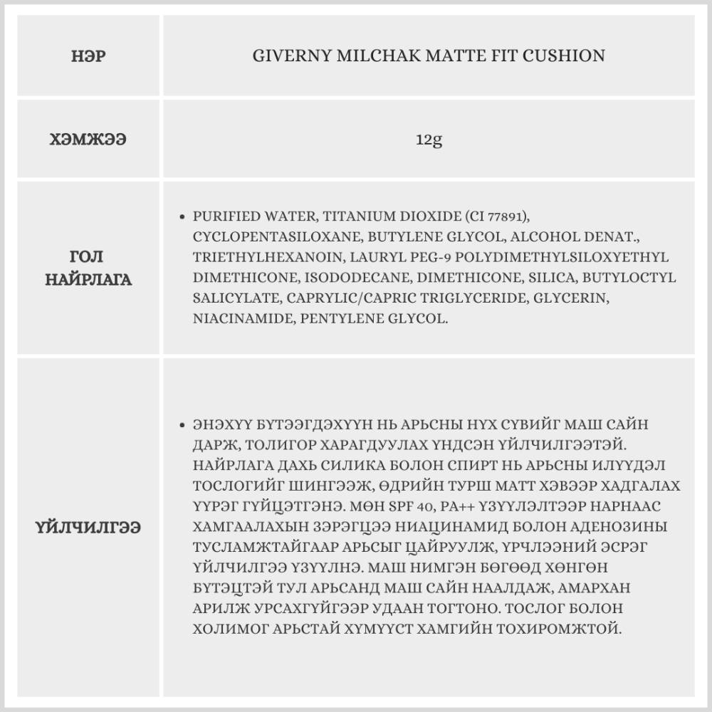 Энэхүү cushion нь цайруулах болон үрчлээний эсрэг үйлчилгээтэй бөгөөд давхар нарнаас хамгаалах SPF 40, PA++ хамгаалттай. Нүхжилт болон өө сэвийг сайн далдлах, арьсанд маш сайн наалдаж өгөх ба, тослогийг хянаж матт болгох зориулалттай. Тослог болон холимог арьсанд тохиромжтой. Запас дагалдана.