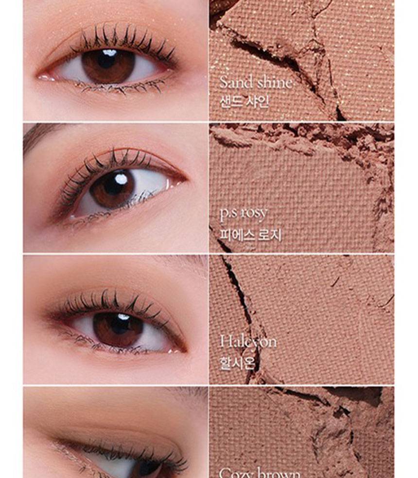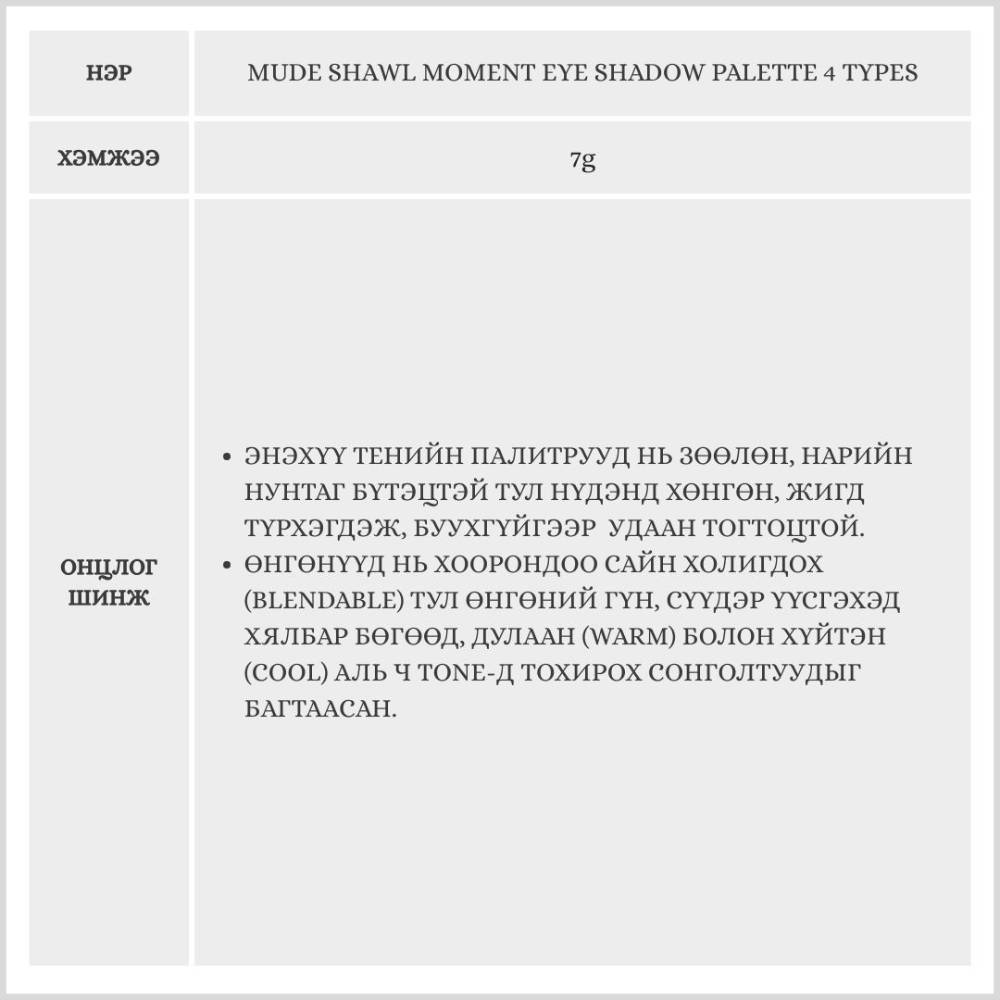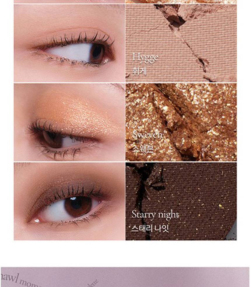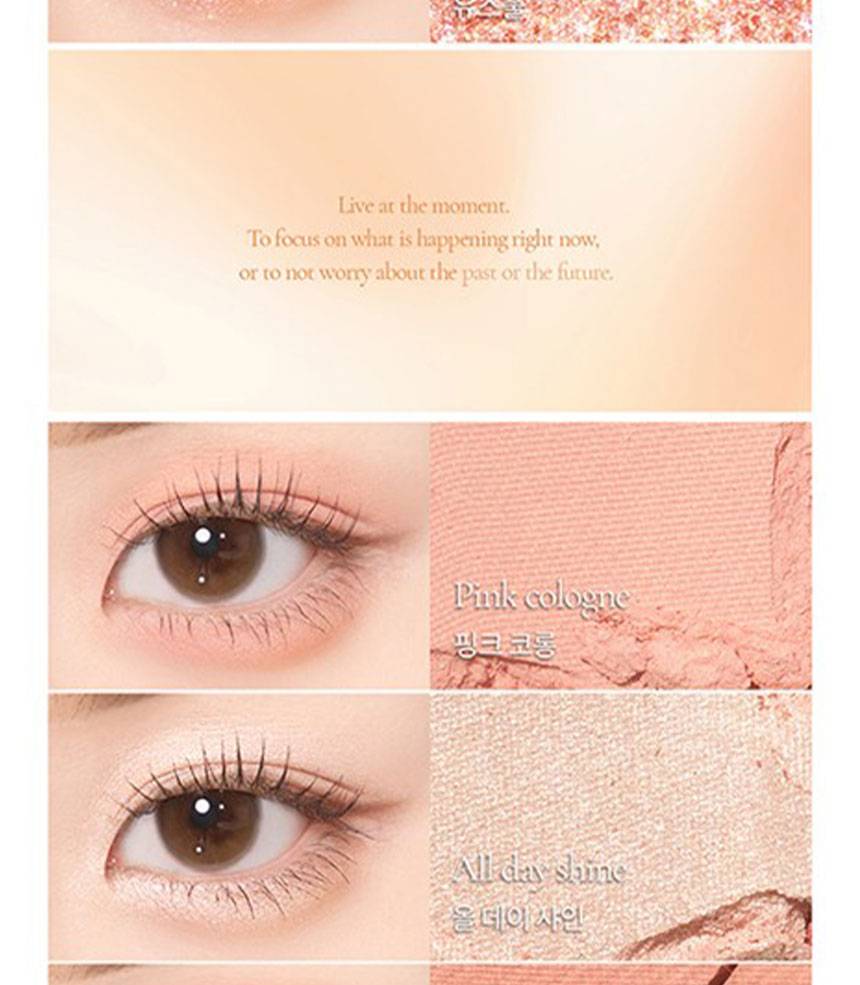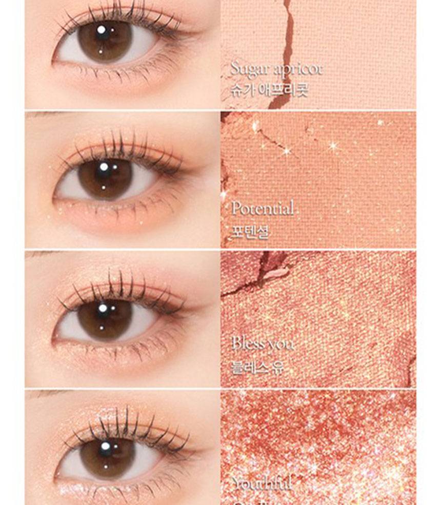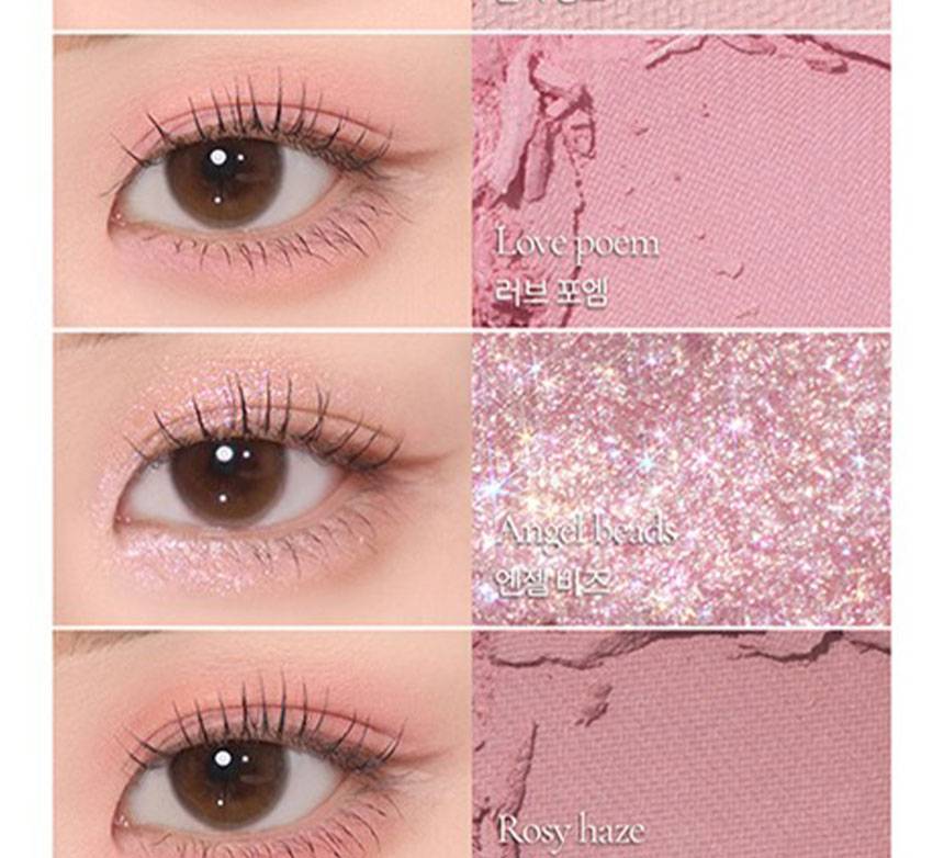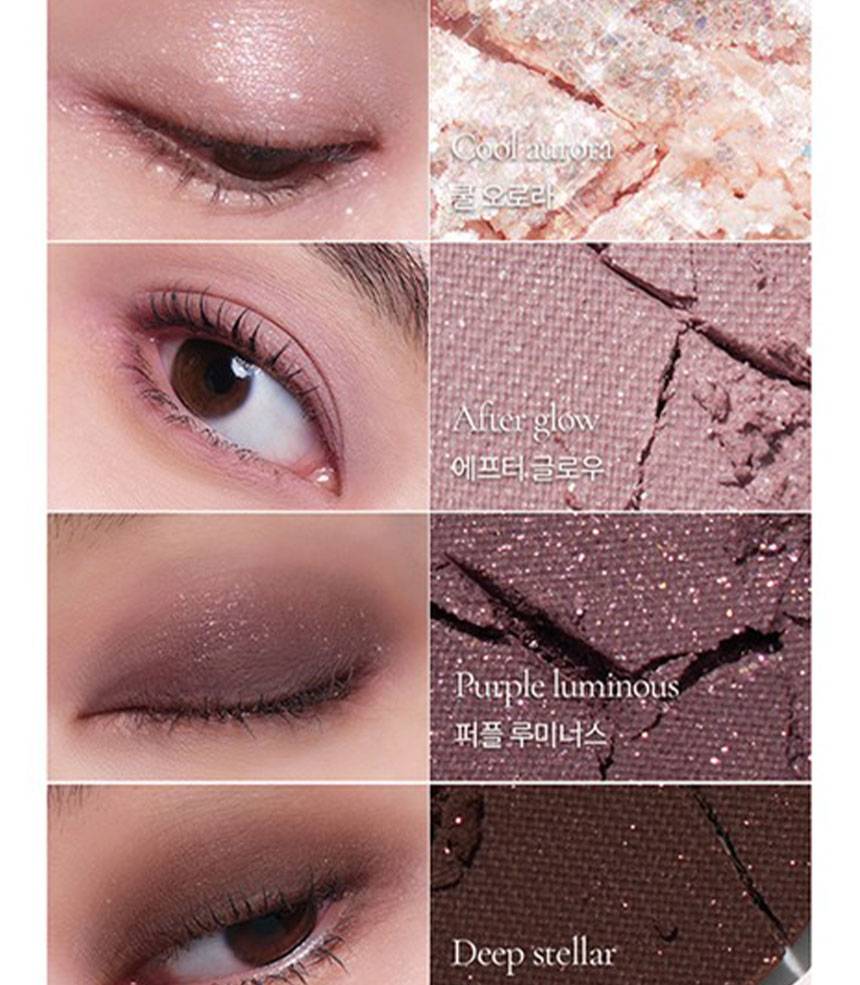 Matte, Shimmer, Glitter зэрэг олон төрлийн бүтэцтэй өнгөнүүдийг нэгтгэсэн бөгөөд, нүдэнд зөөлөн, натурал, зөөлөн, романтик будалт хийх боломжтой.