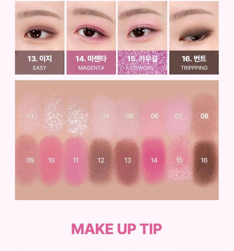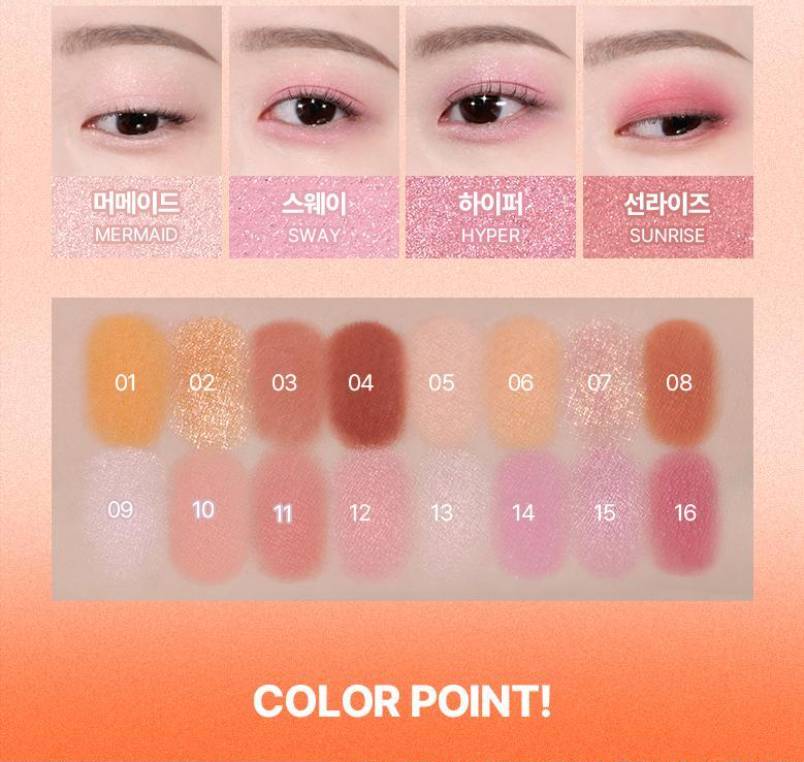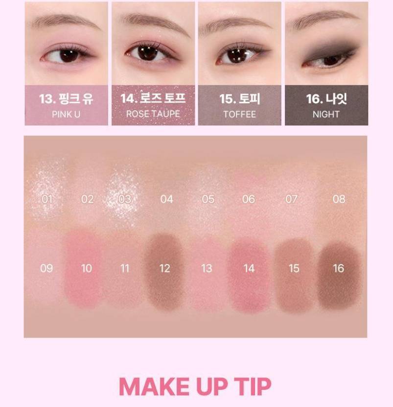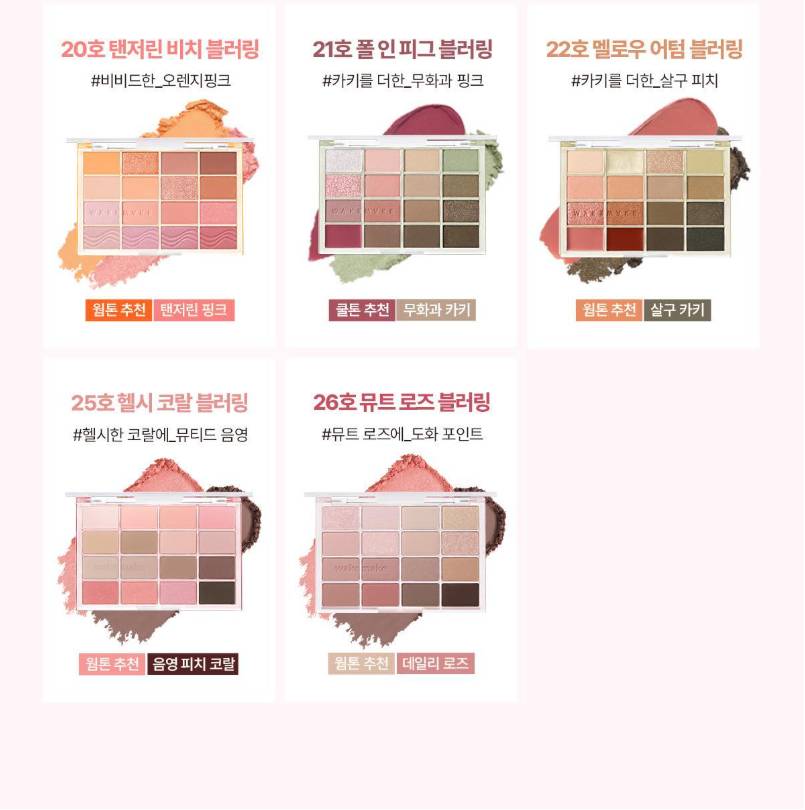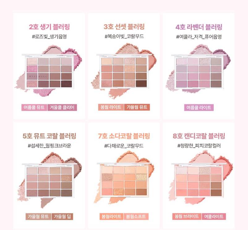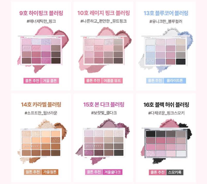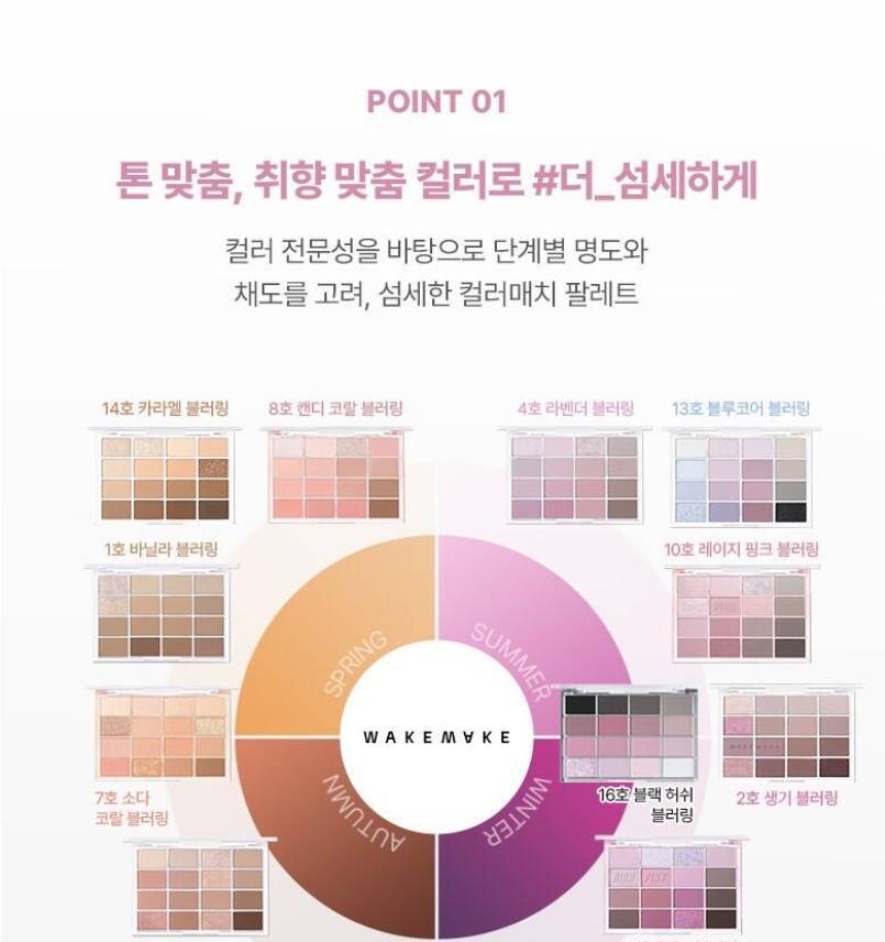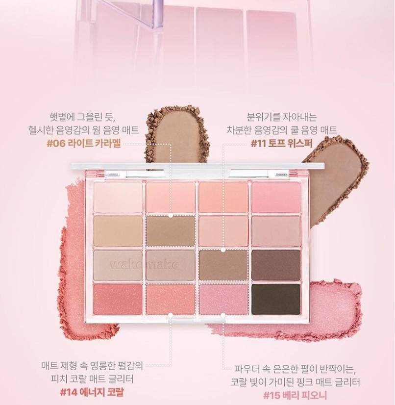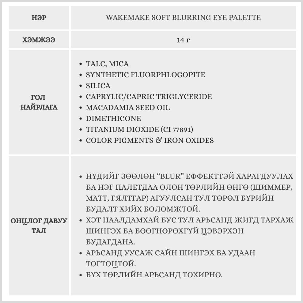 WAKEMAKE-ийн Soft Blurring Eye Palette нь зөөлөн “blur” эффекттэй бөгөөд палетдаа 16 өнгөний сонголттой нүдний тень юм. Матт, шиммер, гялалзсан гээд олон төрлийн өнгийг агуулсан ба энгийн, гоёлын гээд бүх төрлийн будалт хийх боломжтой.