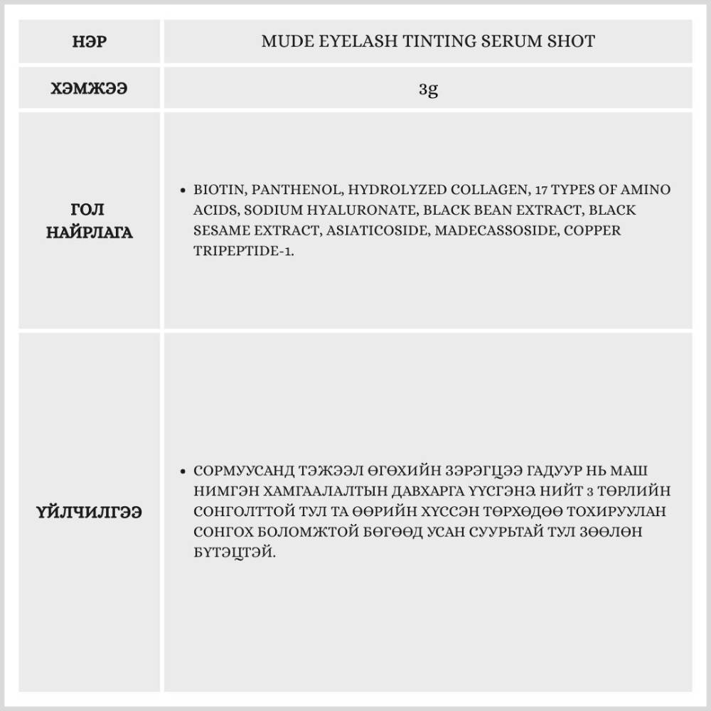 Сормуусны тэжээл болон сормуусны будгийг нэг дор хослуулсан бүтээгдэхүүн юм. Өндөр концентрацитай тэжээлийн найрлагатай тул сормуусыг чийгшүүлж, өтгөн ургахад тусална.