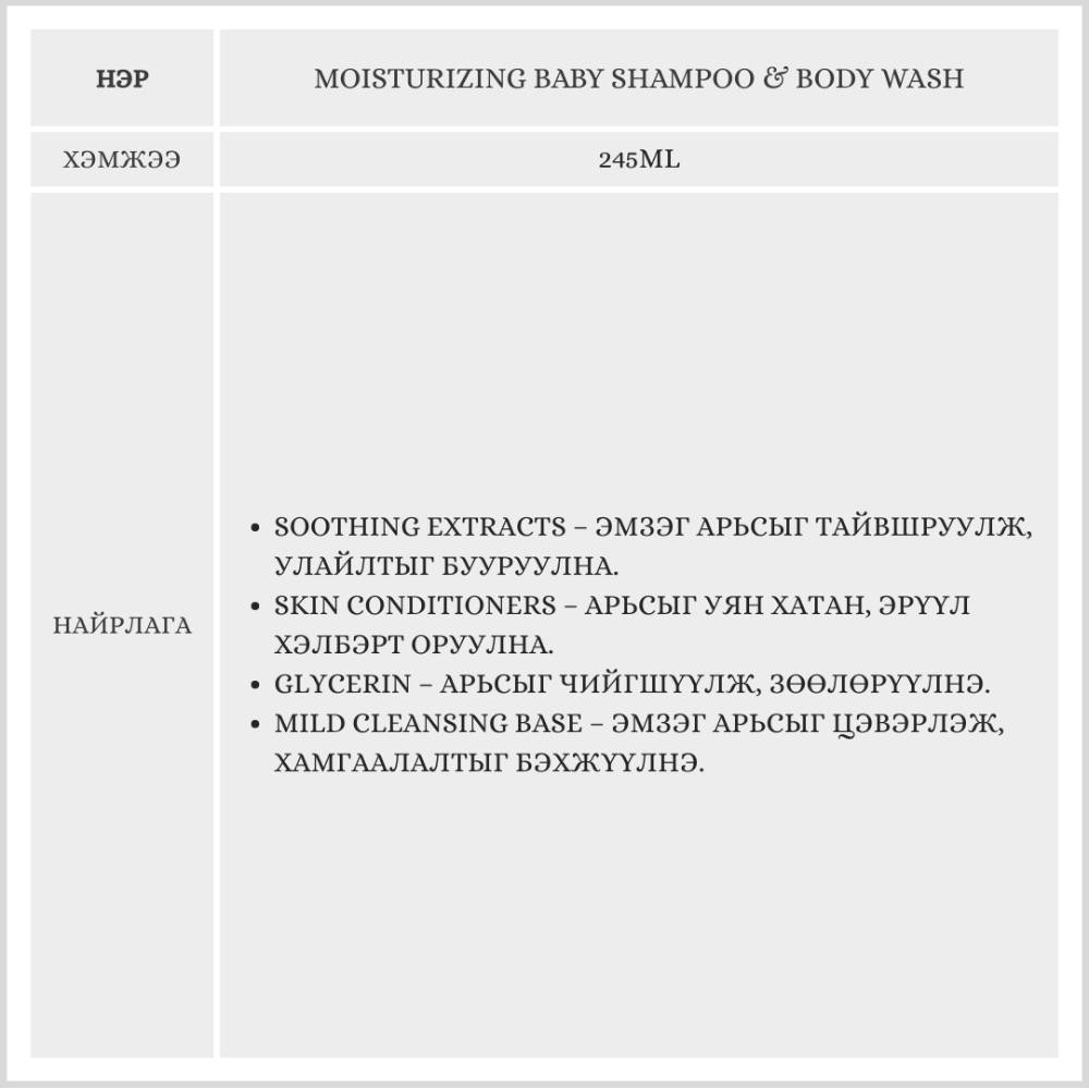 Нярай болон хүүхдийн эмзэг арьсанд зориулсан энэхүү 2 in 1 шампунь, биеийн шингэн саван нь арьс, үсийг маш зөөлөн цэвэрлэж, хуурайшил болон эмзэгшилтийг бууруулна. Хэрэглэсний дараа үс, арьсыг булбарай зөөлөн болгож, таатай мэдрэмж үлдээнэ.