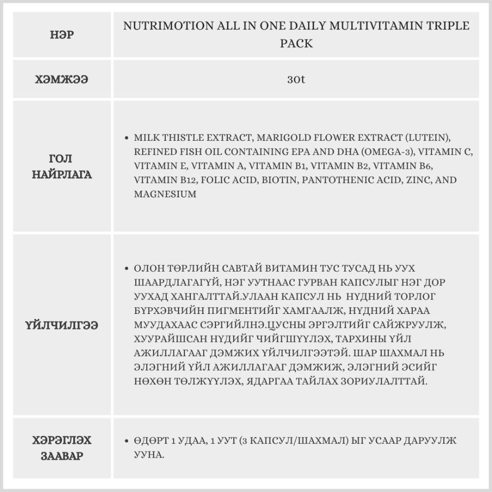 Нэг дор олон төрлийн шим тэжээлийг маш өндөр тунгаар, хялбар аргаар авах зориулалттай гурвалсан үйлчилгээт бүтээгдэхүүн юм.Нийт 13 төрлийн витамин болон эрдэс бодисыг агуулсан. Энэ нь биеийн ерөнхий дархлааг дэмжиж, эрчим хүчээр хангана.