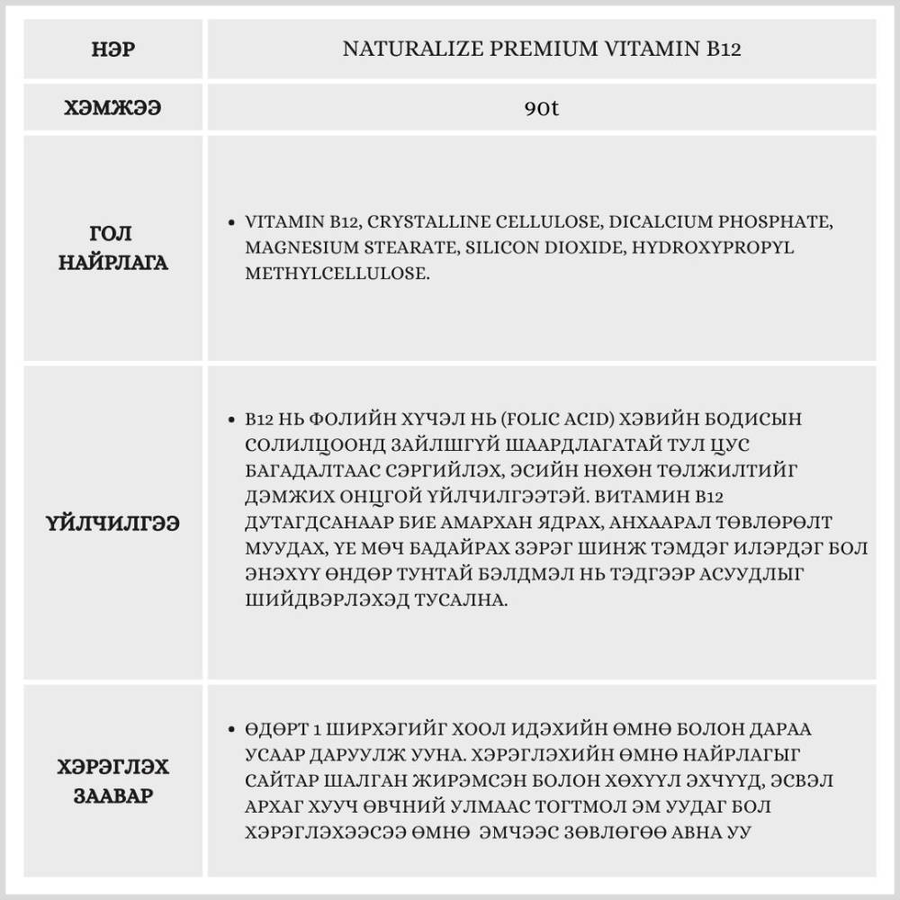 Энэхүү бүтээгдэхүүн нь витамин B-ийн төрлүүдээс зөвхөн Витамин B12-ийг өндөр тунгаар агуулсан нэмэлт тэжээл юм. Витамин B12 нь хүний биед цусны улаан эс бүрэлдэх болон мэдрэлийн системийн хэвийн үйл ажиллагаанд амин чухал үүрэг гүйцэтгэдэг.