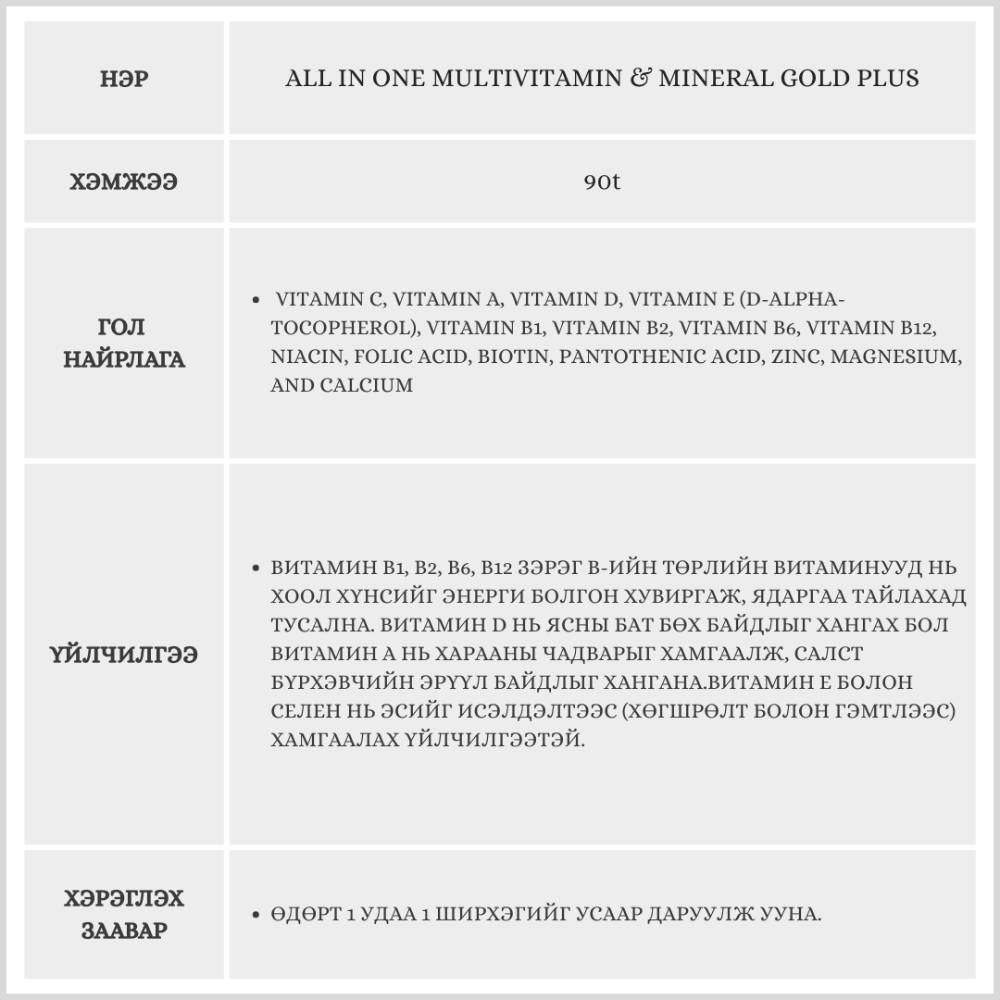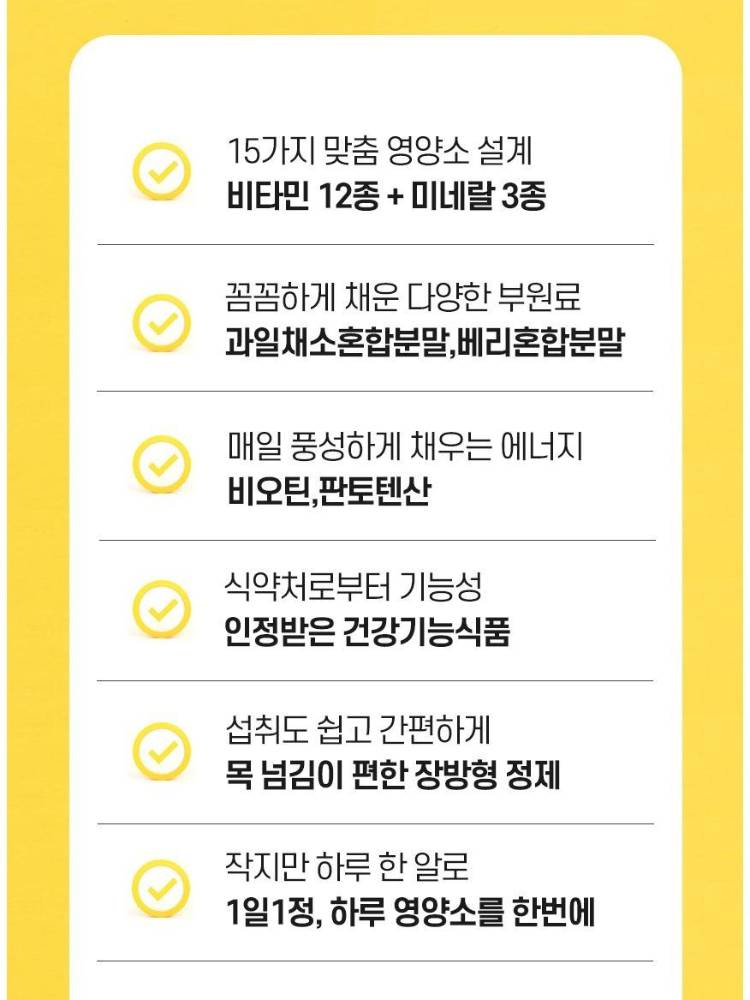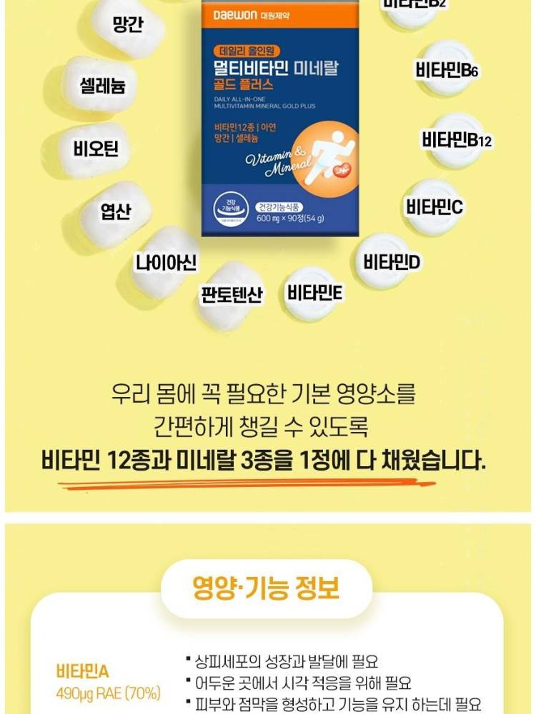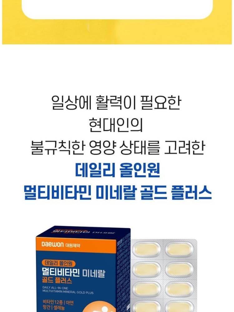Солонгосын эмийн үйлдвэрлэлийн салбарт нэр хүндтэй Daewon Pharm компанийн бүтээгдэхүүн тул чанар, аюулгүй байдал нь баталгаажсан. Витамин болон эрдэс бодисыг нэг шахмалд багтаасан тул биеийн ерөнхий эрүүл мэндийг цогцоор нь дэмжинэ.