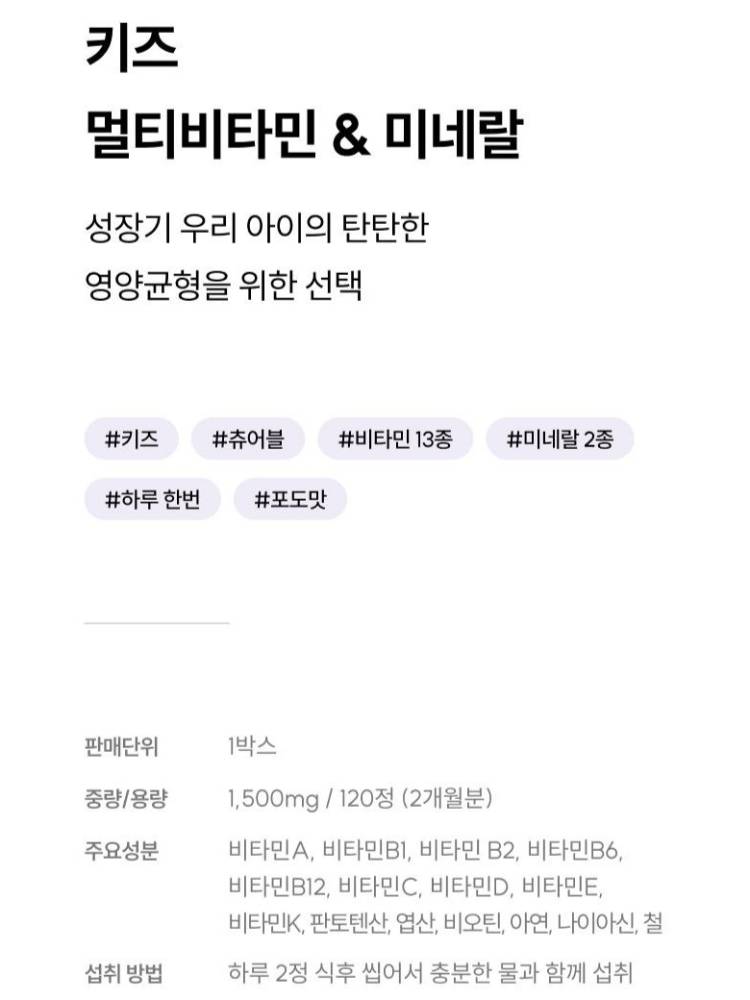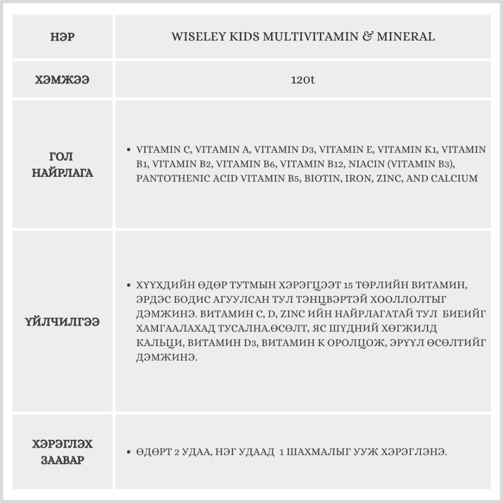 Энэхүү мультивитамин нь 120 ширхэгтэй, 2 сарын хэрэгцээг хангана. Усан үзмийн амттай тул хүүхдэд уухад тохиромжтой. 3–14 насны бүх насны хүүхдэд зориулагдсан бөгөөд дархлааг дэмжиж, өсөлт хөгжилд үр дүнтэй нөлөө үзүүлнэ.