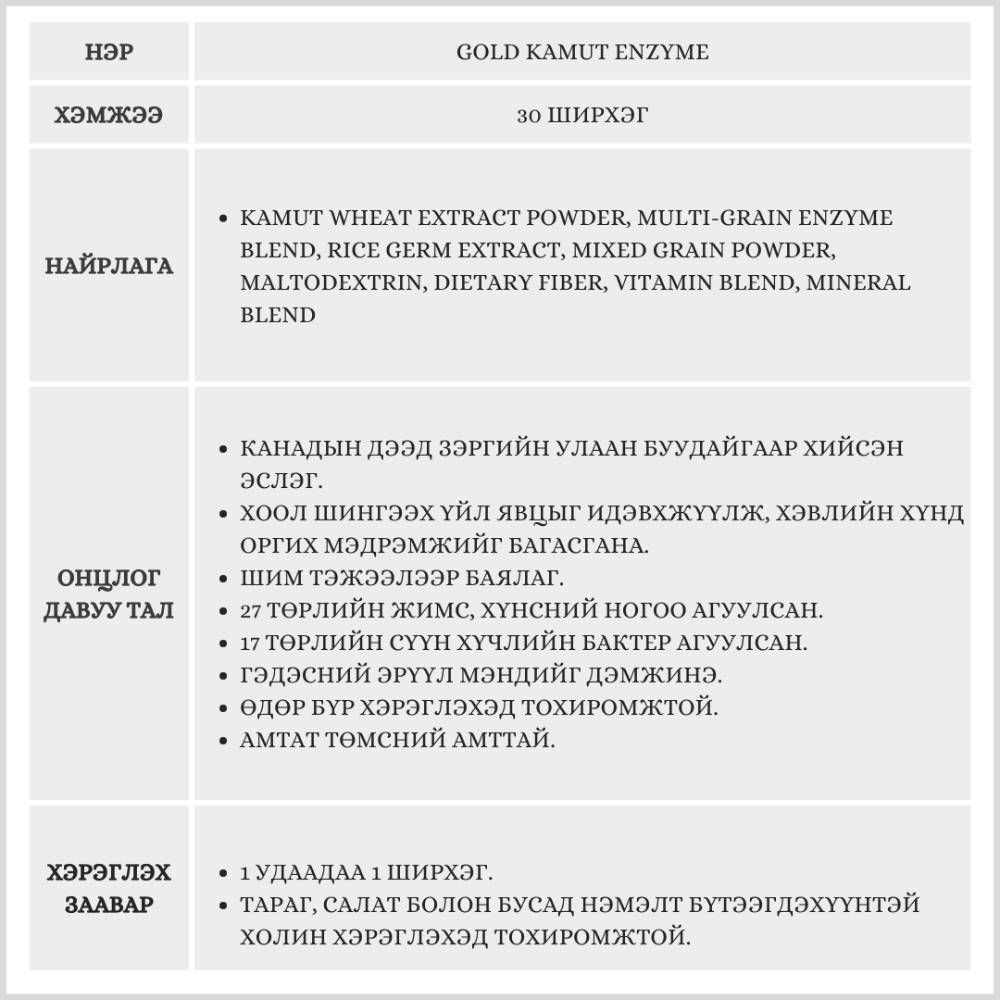 Канадын дээд зэргийн улаан буудайгаар хийсэн найрлагатай. 27 төрлийн жимс, хүнсний ногоо, 17 төрлийн сүүн хүчлийн бактери агуулсан гэдэсний эрүүл мэндийг дэмжих уураг, өөх тос, нүүрс усыг задлагч.