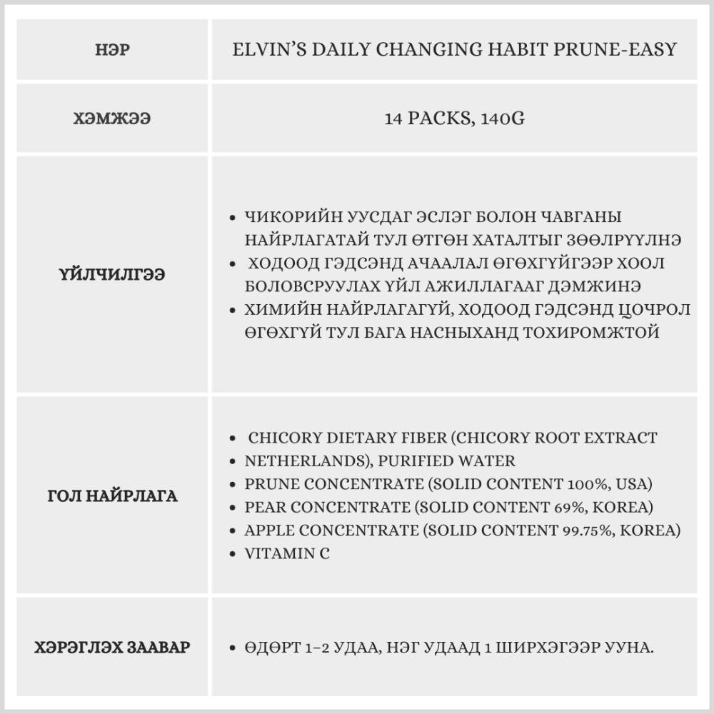 Байгалийн чавга болон эслэгийг найрлагандаа агуулсан. Гэдэсний гүрвэлзэх хөдөлгөөнийг дэмжин өтгөн хаталтыг арилгана. Хүүхдүүдийн дуртай амттай бөгөөд авч явахад хялбар савлагаатай.