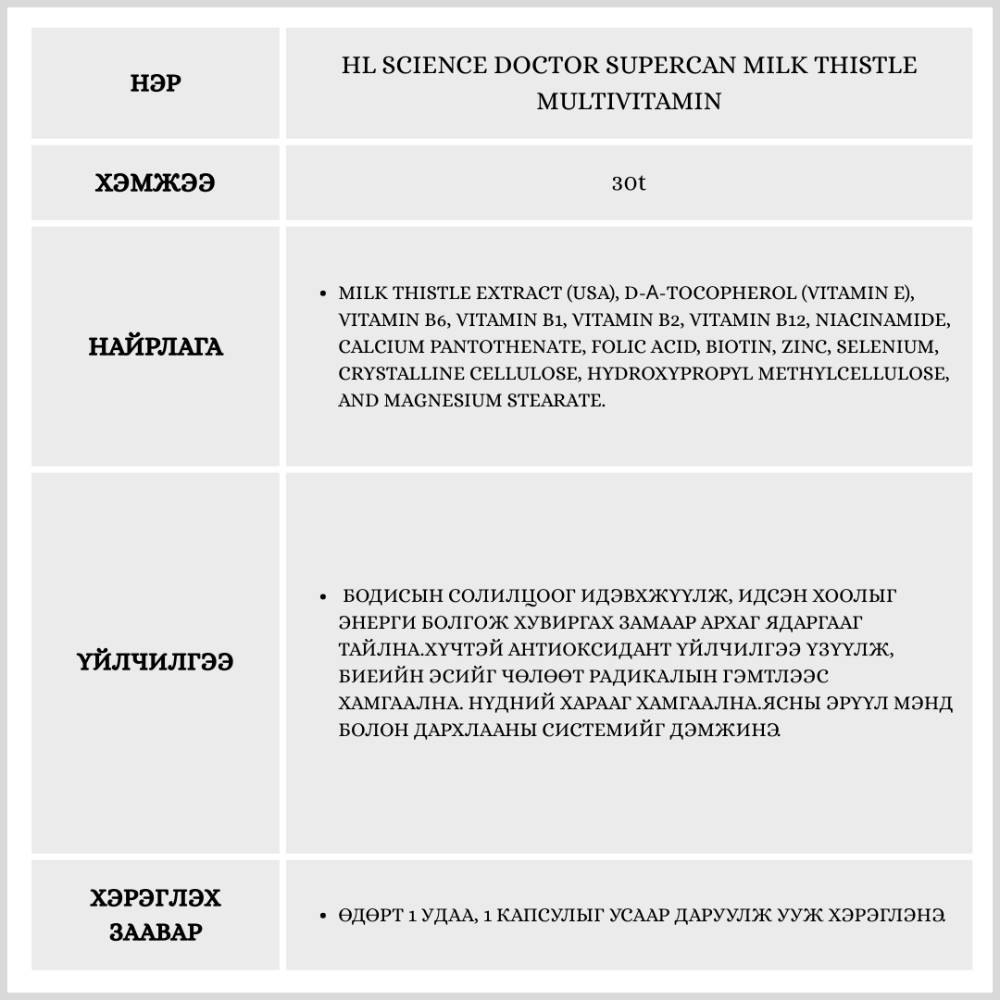 Энэхүү витамин нь 30 ширхэгтэй бөгөөд 1 сарын хэрэгцээг хангана. Элэгний ерөнхий эрүүл мэндийг дэмжиж, элэгний эсийг хорт бодисоос хамгаалан, нөхөн төлжилтийг идэвхжүүлнэ.