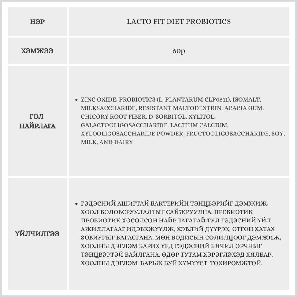 Уг ашигтай бактери нь 13төрлийн ашигтай бактери агуулсан ба цайр орсон тул дархлааг дэмжинэ. Дэглэм барьж буй хүмүүст тохиромжтой бөгөөд биеийн өөх тосыг дарангуйлахад тусалдаг ургамлын гаралтай түүхий эд агуулсан гэдгээрээ онцлог юм.