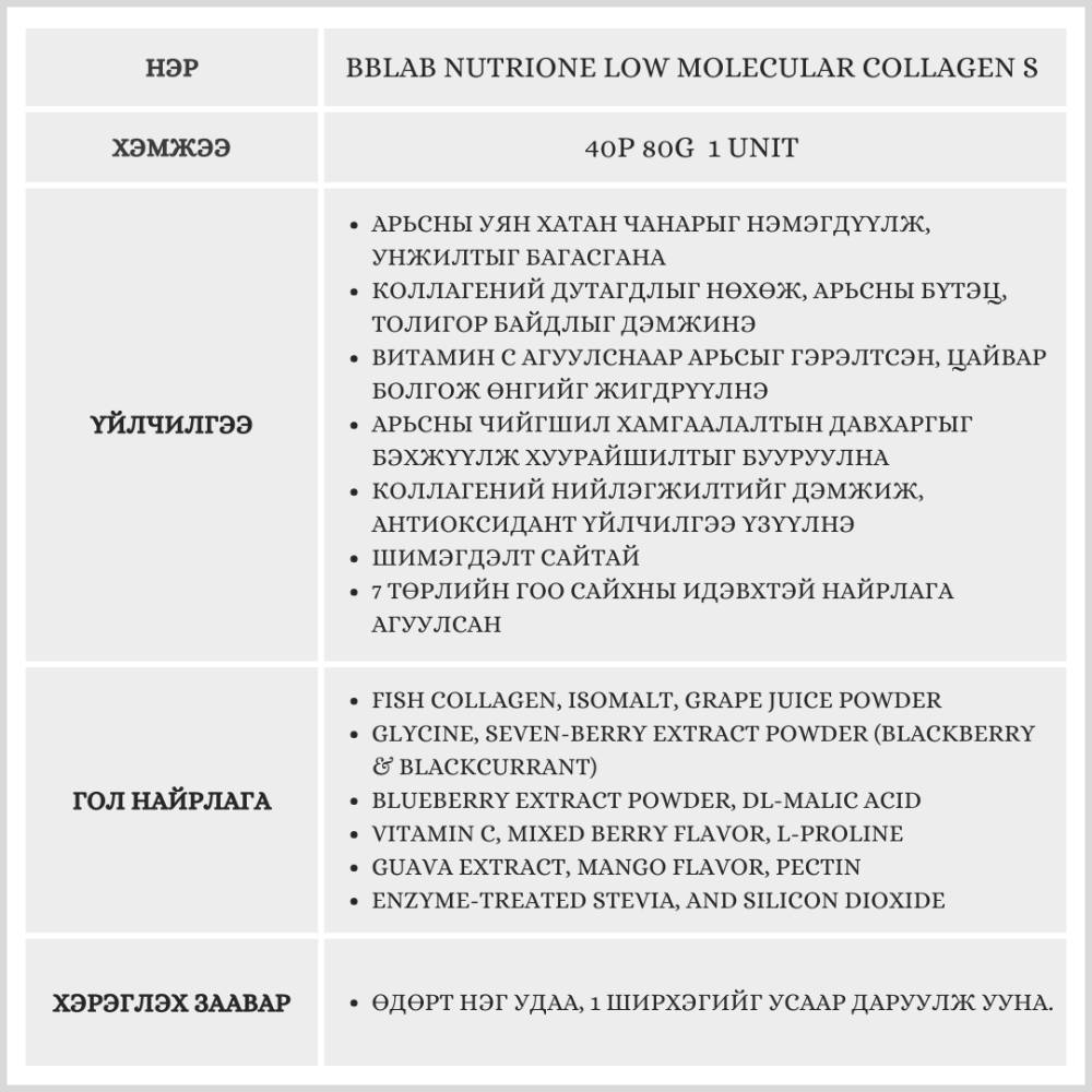 Энэхүү бүтээгдэхүүн нь жижиг молекулт загасны коллаген агуулснаар арьсанд хурдан шимэгдэж, уян хатан байдал болон толигор байдлыг дэмжинэ.Витамин C болон 7 төрлийн жимсний экстракт-аар баяжуулсан тул арьсыг гэрэлтүүлж, антиоксидант хамгаалалтыг нэмэгдүүлнэ.Амттай бөгөөд өдөр бүр хэрэглэхэд хялбар.