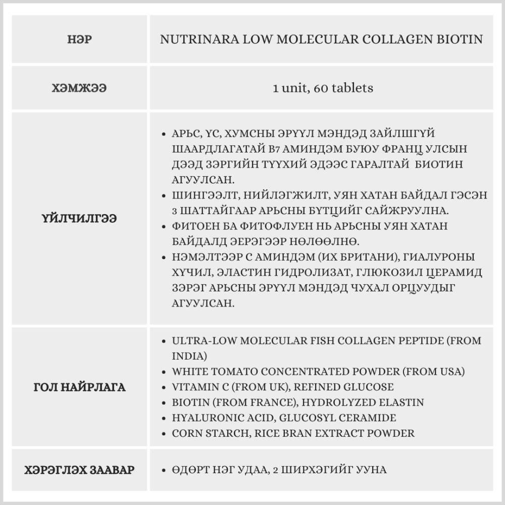 Францын өндөр чанарын түүхий эдээс гаргаж авсан биотин (В7 аминдэм) агуулсан тул арьс, үс, хумсны эрүүл байдлыг дэмжинэ.С аминдэм, гиалуроны хүчил, эластин гидролизат, глюкозил церамид болон фитоен, фитофлуен зэрэг арьсыг чийгшүүлж, уян хатан болгох чухал орцуудыг агуулсан.