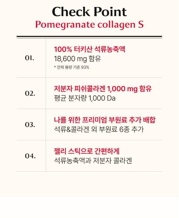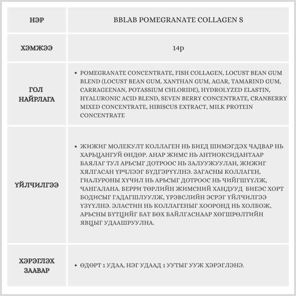 Анар жимсний найрлагатай, хэрэглэхэд хялбар энэхүү коллаген нь арьсны уян хатан чанарыг сайжруулах, чийгшүүлэх үйлчилгээтэй ба биед сайн шингэж өгдөг давуу талтай. Эрэгтэй, эмэгтэй хүйс харгалзахгүй хэрэглэж болох ба нэг өдрийн коллагены хэрэгцээг 1 уутаар шийдэх боломжтой.