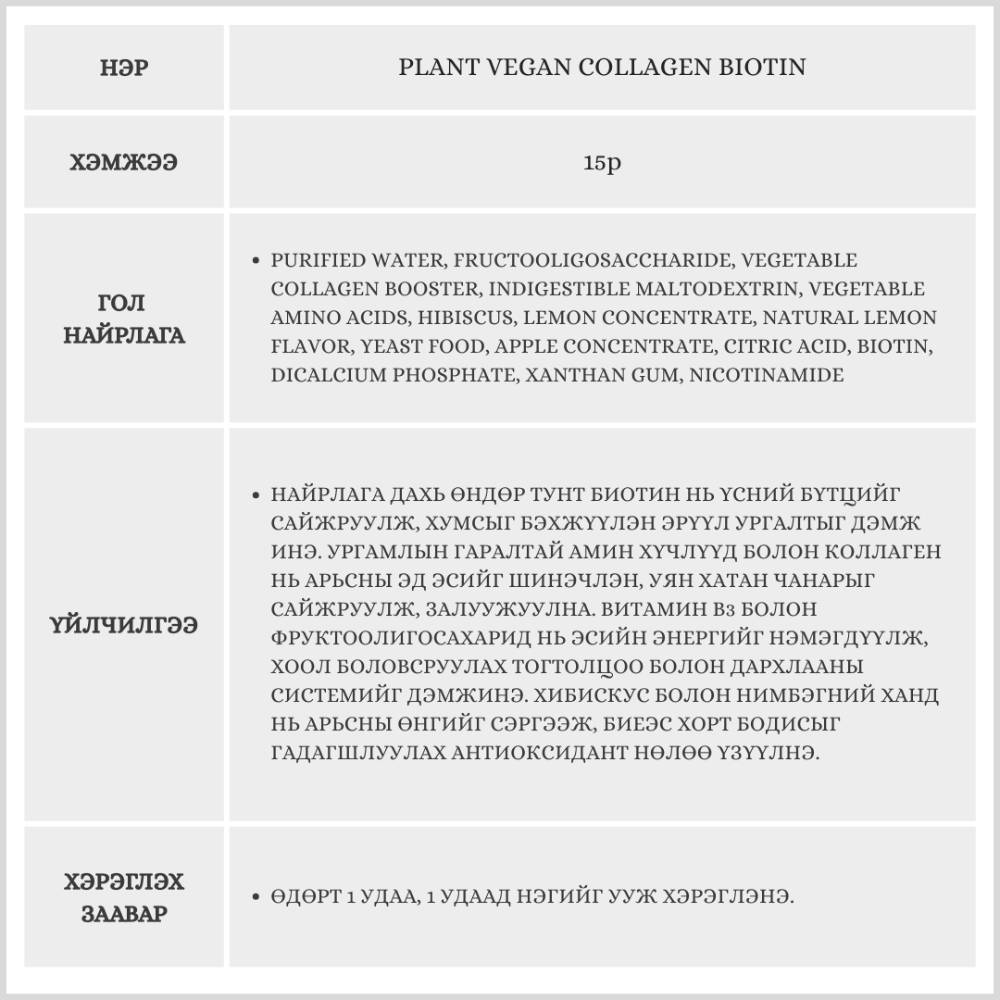 Plant брэндийн уг бүтээгдэхүүн нь ургамлын гаралтай коллаген бөгөөд давхар үс уналт болон хумс хугаралтанд тустай биотин агуулснаараа давуу талтай. 15 ширхэгтэй ба өдөрт нэгийг 1 удаа ууна.