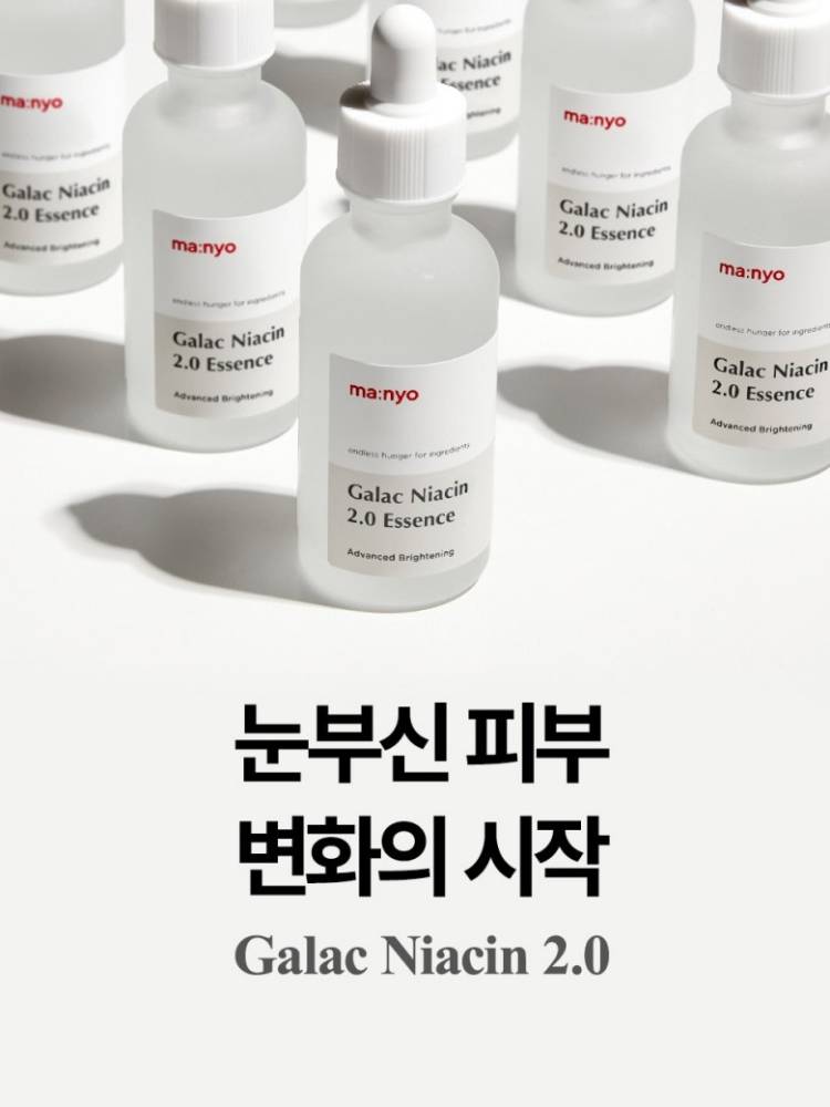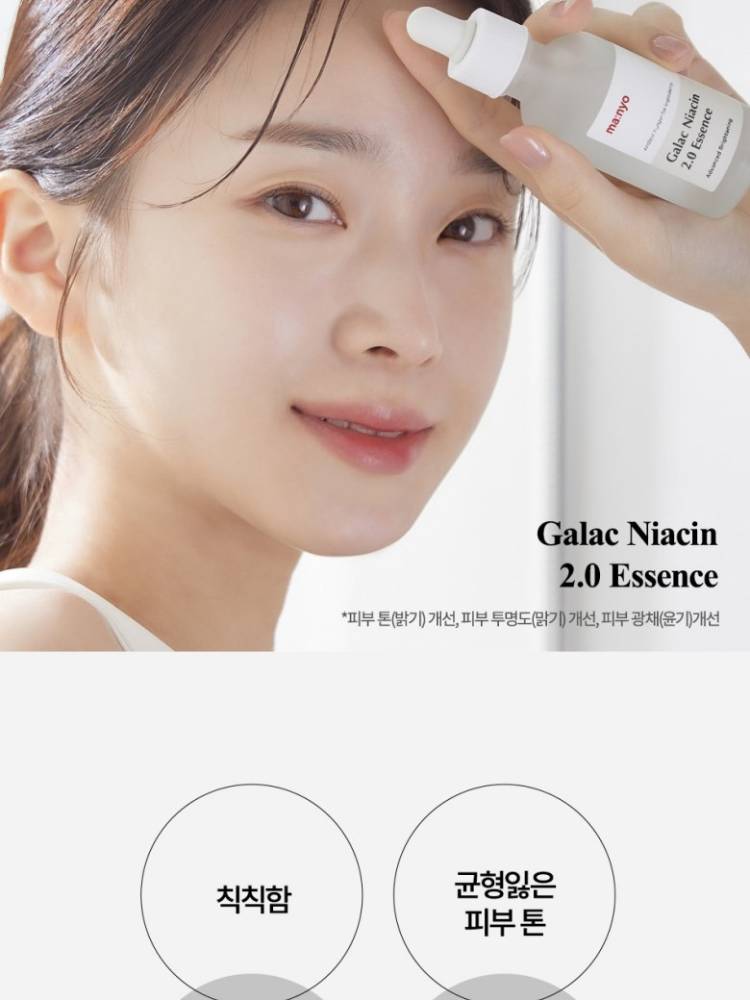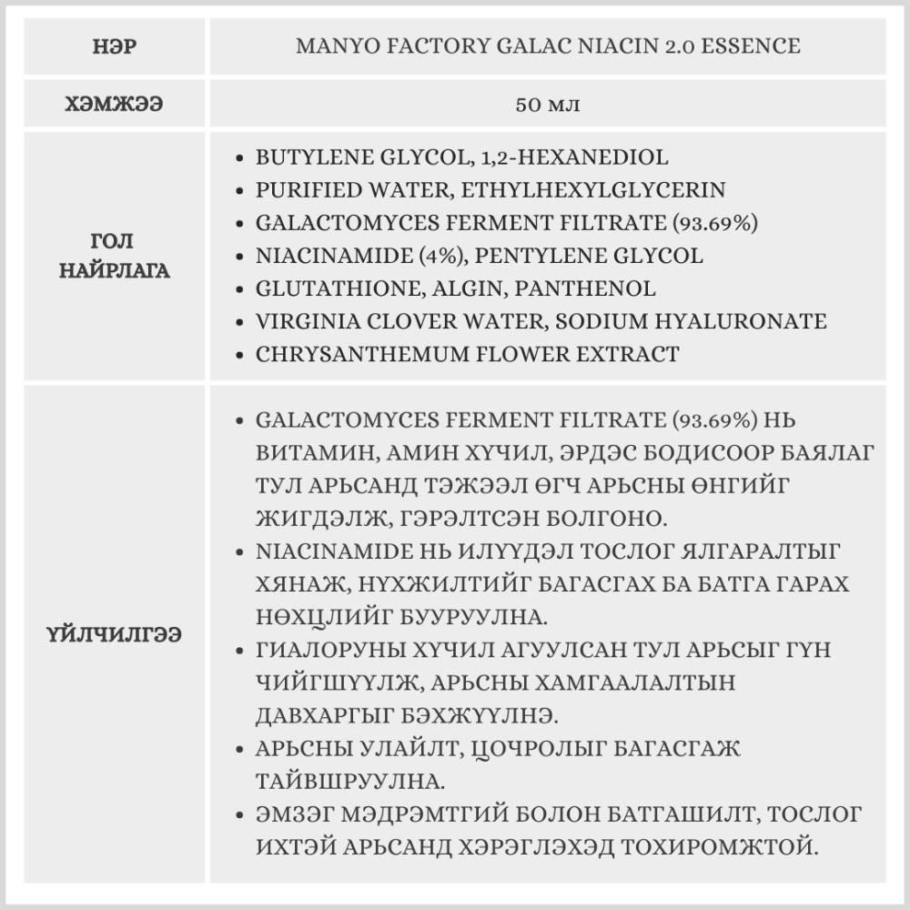 ma:nyoManyo Factory Galac Niacin 2.0 Essence нь өндөр агууламж бүхий Galactomyces Ferment болон Niacinamide найрлагатай, арьсны өнгийг жигдэлж гэрэлтсэн болгох болон тослогийг тэнцвэржүүлэх үндсэн үйлчилгээтэй эссенц юм. Батгашилт болон тослог ихтэй, эмзэг мэдрэмтгий арьсанд хэрэглэхэд тохиромжтой.