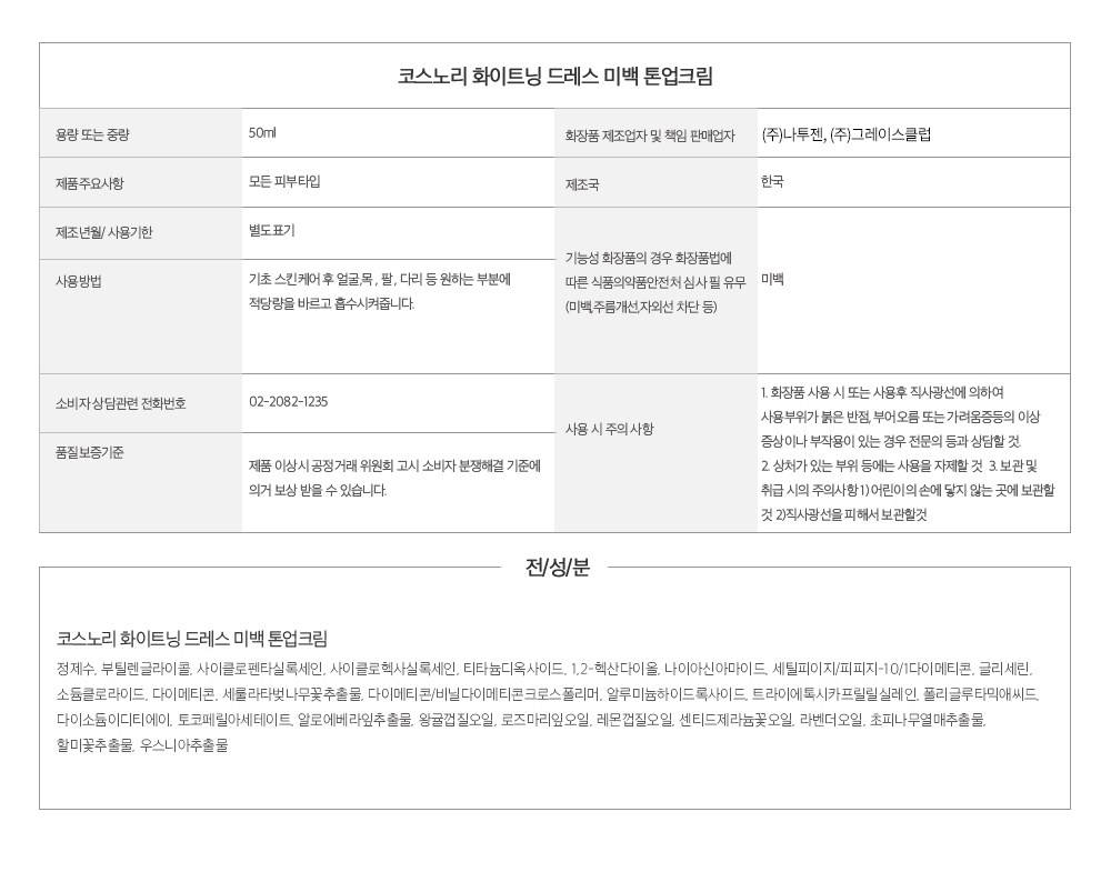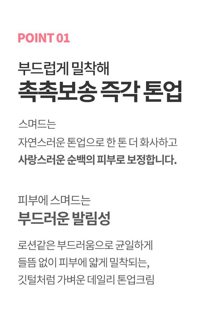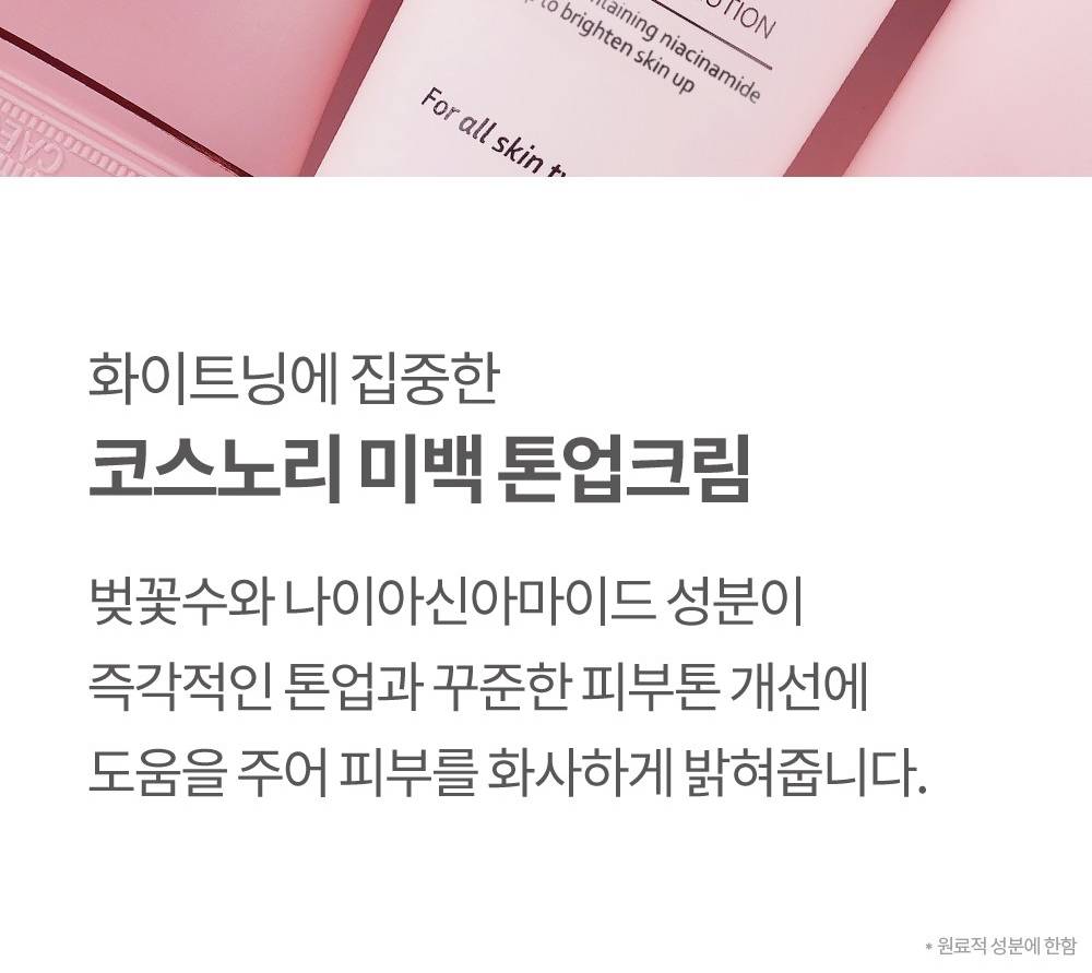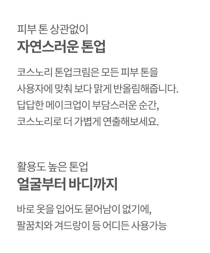 Cosnori брэндийн уг бүтээгдэхүүн нь бүх төрлийн арьсанд зориулагдсан бөгөөд арьсыг гэрэлтсэн, өө сэвгүй харагдуулах зориулалттай тон-ап крем юм. Нүүр будалт суурь болон өнгө сэргээх үйлчилгээтэй, өдөр тутмын будалтанд тохиромжтой.