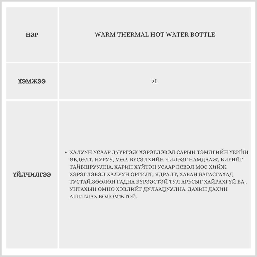 Энэхүү бүтээгдэхүүн нь халуун болон хүйтэн жин болгон ашиглах боломжтой.Халуун усаар дүүргэж хэрэглэвэл сарын тэмдгийн үеийн өвдөлт, нуруу, мөр, бүсэлхийн чилээг намдааж, биеийг тайвшруулна. Харин хүйтэн усаар эсвэл мөс хийж хэрэглэвэл халуун оргилт, ядралт, хаван багасгахад тустай.