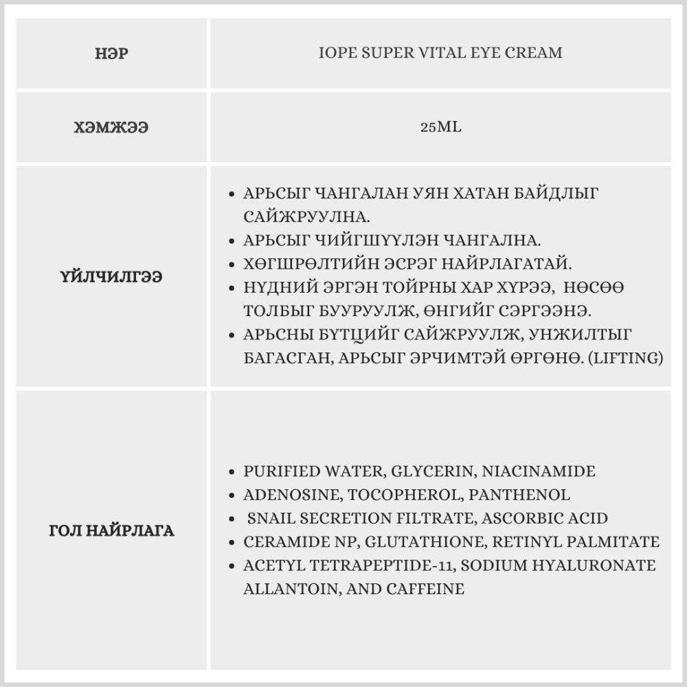 Хөгшрөлтийн эсрэг найрлагатай. Нүдний эргэн тойрны хар хүрээ, нөсөө толбыг бууруулж, өнгийг сэргээнэ.Арьсны бүтцийг сайжруулж, унжилтыг багасган, арьсыг эрчимтэй өргөнө.