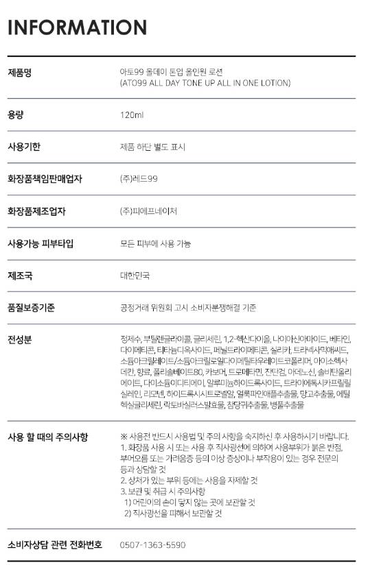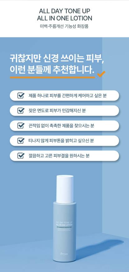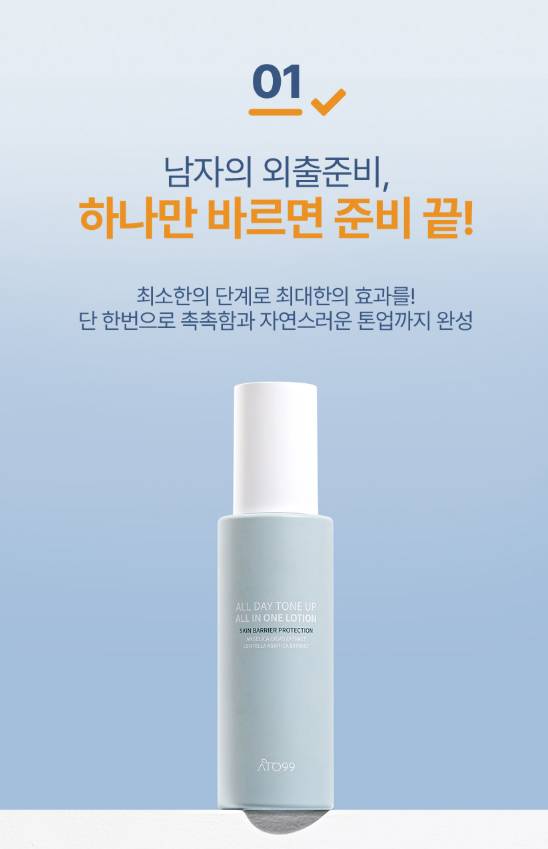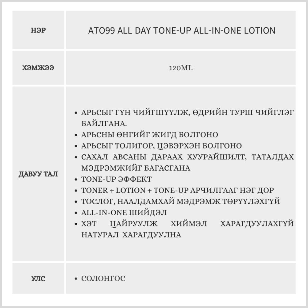 Өмнөд Солонгосын арьс арчилгааны брэнд Ato99-ийн эрчүүдэд зориулсан олон үйлдэлт лосьон. Tone-Up эффект нь Арьсны өнгийг жигд болгох ба All-in-One бүтэц нь toner, лосьон, эссенс хослуулсан олон үйлдэлт арьс арчилгааны бүтээгдэхүүн. Арьсыг гүн чийгшүүлж, хуурайшилтаас сэргийлнэ.