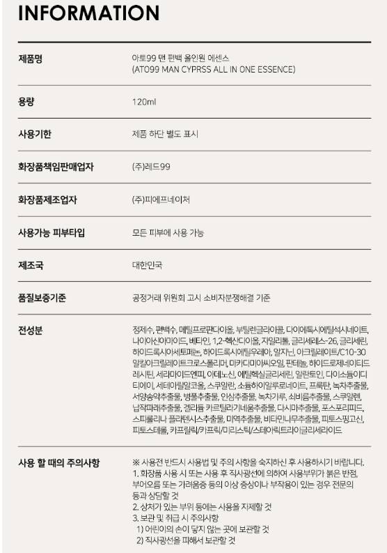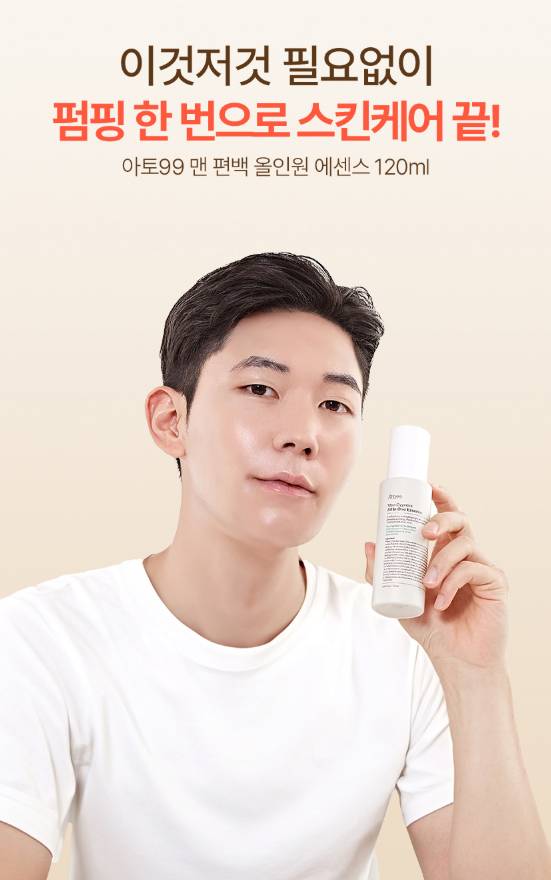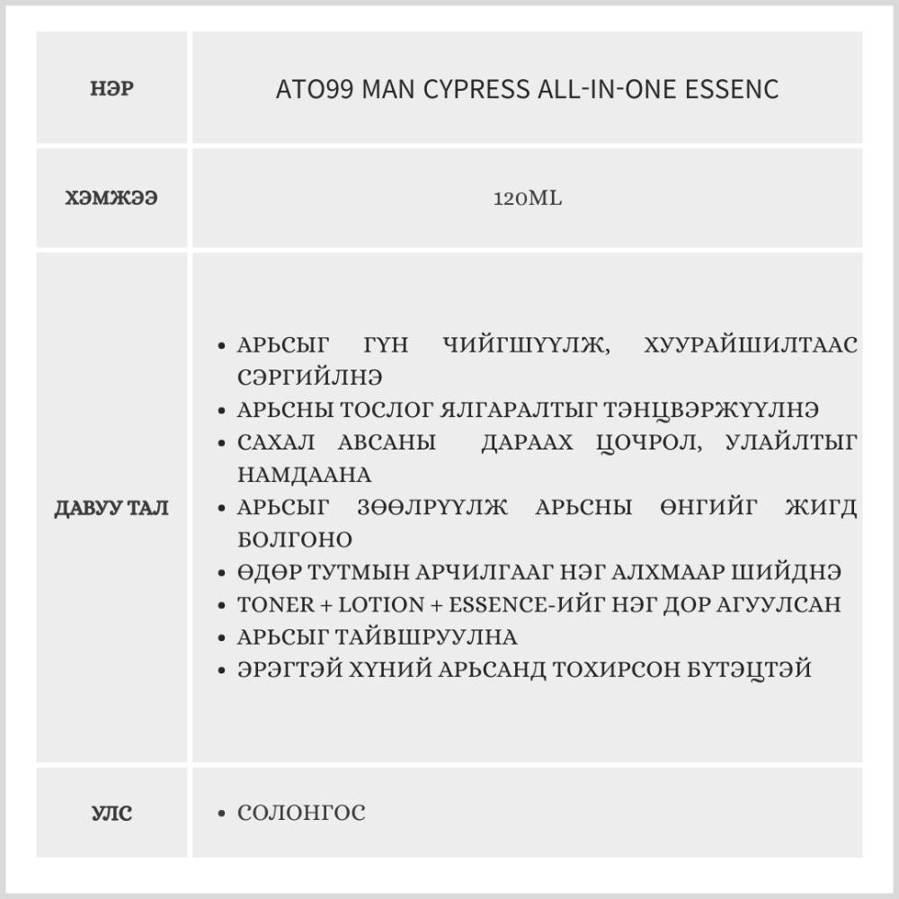 Өмнөд Солонгосын арьс арчилгааны брэнд Ato99-ийн эрчүүдэд зориулсан 3-н алхмын арьс арчилгааг нэг дор шингээсэн эссенс нь арьсыг тайвшируулах, чийгшүүлэх, тослогийг тэнцвэржүүлэх найрлагатай.Тонер, Essence, Moisturizer 3-н үндсэн алхмыг нэгтгэсэнээрээ давуу талтай.