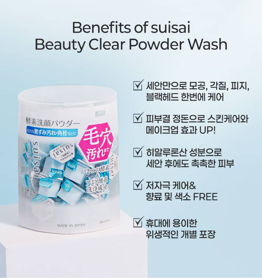 Suisai Beauty Clear Powder Wash нь Канебогийн алдарт ферментэн нунтаг нүүр угаагч бөгөөд арьсны бохирдол, бөглөрсөн нүх сүв, хар батга, тослог, үхэжсэн арьсны давхаргыг маш үр дүнтэй цэвэрлэнэ. Угаасны дараа арьсыг таталдуулж, хуурайшуулахгүй ба нэг удаагийн хэрэглээ бүхий капсул савлагаатай.
