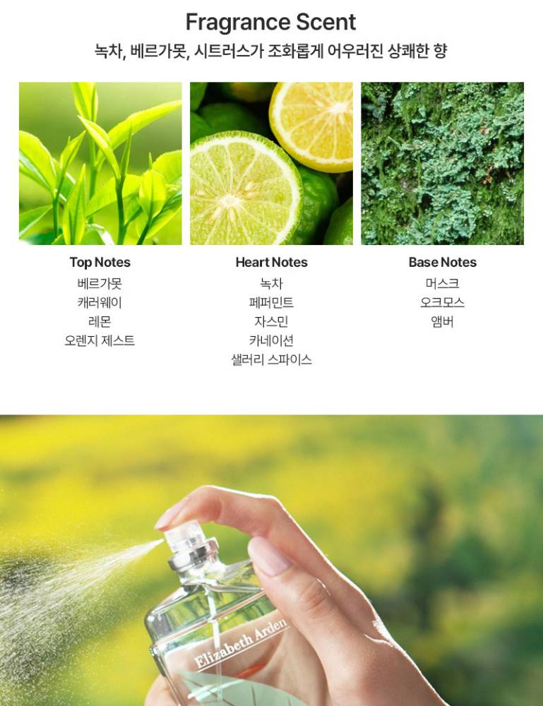 Дэлхийд танигдсан Elizabeth Arden брэндийн сэнгэнэсэн, хөнгөн мэдрэмж төрүүлэх Ногоон Цайны/Green Tea/ үнэртэн юм. Энэхүү үнэртэн нь цэнгэг, гаатай, цитрусын/citrus/ анхилуун үнэрийг хослуулснаар сэргэг, тайвшруулах мэдрэмжийг төрүүлнэ.