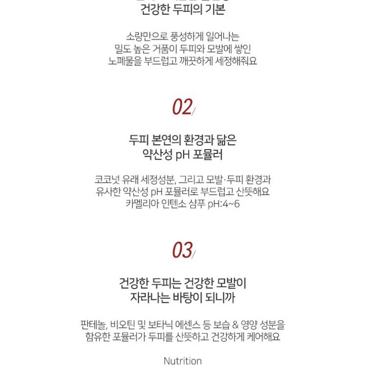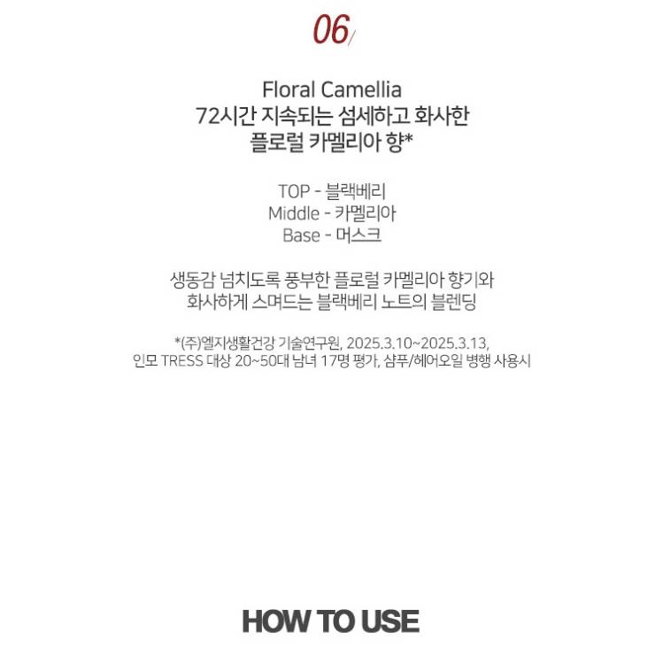 Camellia тосны өндөр тэжээл нь үсний ширхэг бүрт тэжээл өгч, хуурайшилтыг багасгадаг. Гэмтсэн үсийг зөөллөж, гялалзсан эрүүл болгоно. Үсийг нөхөн сэргээх үйлчилгээтэй тул химийн будаг, индүү, сэнс зэрэгт гэмтсэн үсэнд тохиромжтой.