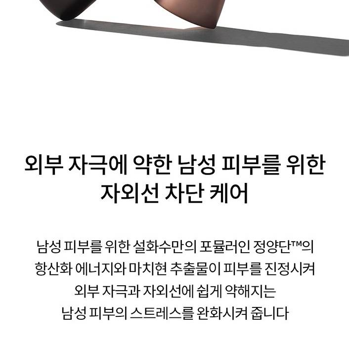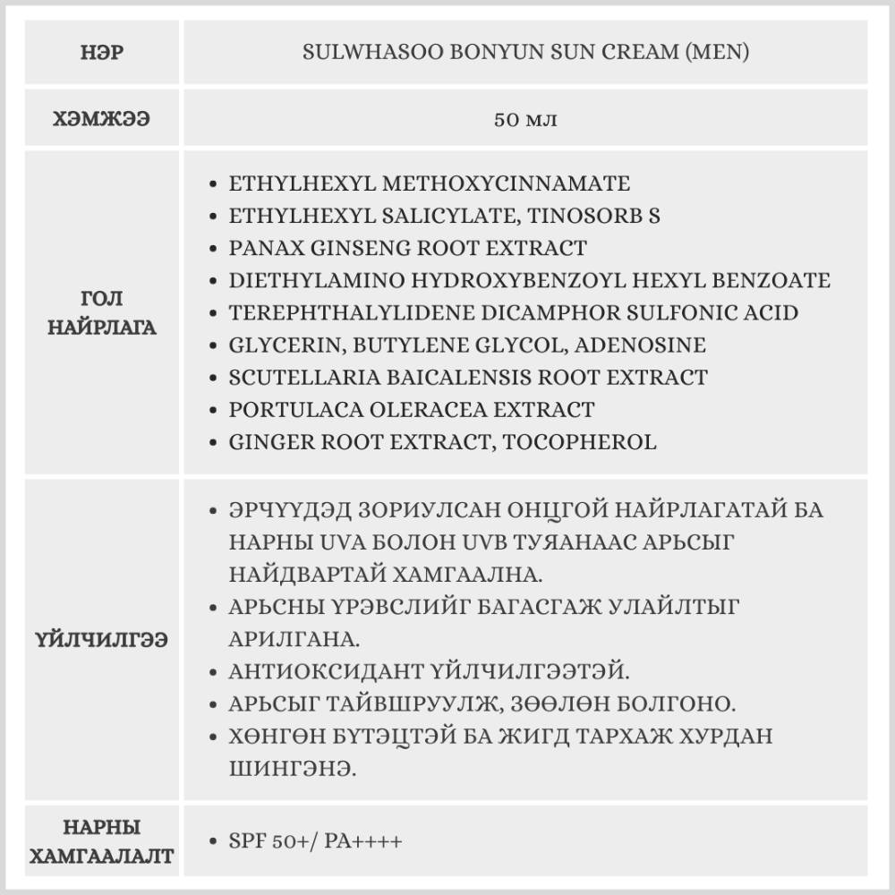 Эрчүүдэд зориулсан Sulwhasoo брэндийн Bonyun нарны тос нь хэт ягаан туяаны хүчтэй хамгаалалттай бөгөөд арьсыг хөгшрөлтөөс хамгаалах өндөр антиоксидант найрлагатай. Наалдамхай биш хөнгөн бүтэцтэй тул арьсанд жигд тархаж хурдан шингэнэ.
