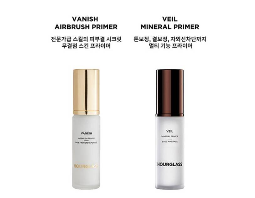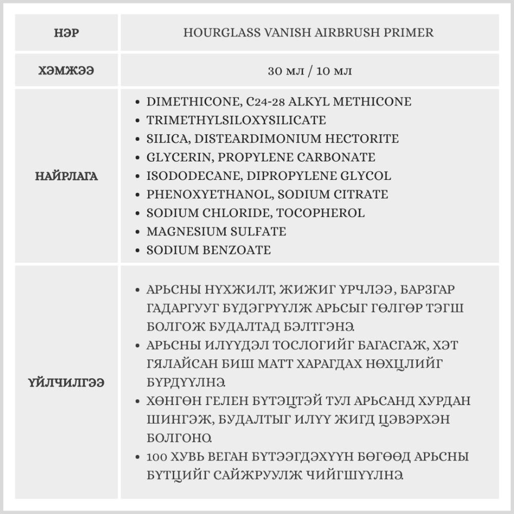 Hourglass Vanish Airbrush Primer нь арьсны нүхжилт, жижиг үрчлээ, барзгар гадаргууг засаж жигд, гөлгөр болгодог хөнгөн, гель бүтэцтэй праймер бөгөөд нүүр будалтын суурь бэлтгэж арьсыг илүү гэрэлтсэн толигор болгох ба будгийн тогтцыг уртасгана.