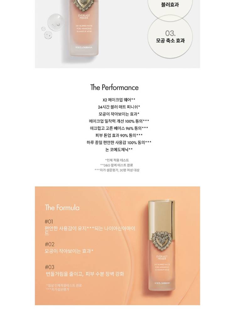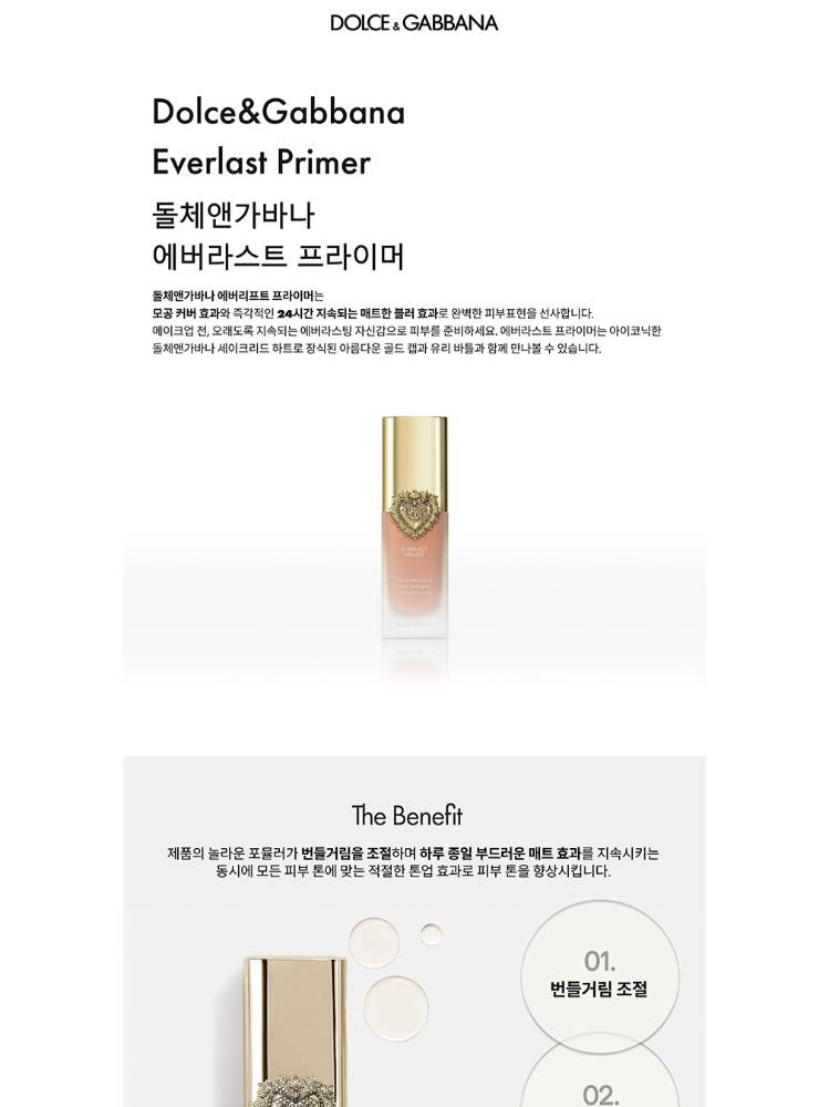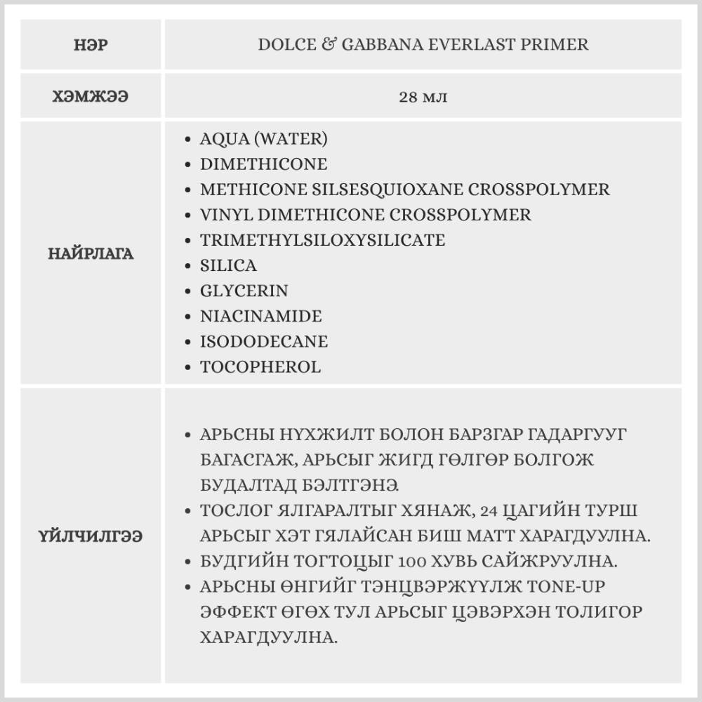 Dolce & Gabbana брэндийн Everlast Primer нь арьсны нүхжилт, барзгар гадаргууг багасгаж арьсыг будалтад бэлтгэн гөлгөр жигд болгох ба 24 цагийн тогтоцтой. Арьсны өнгийг тэнцвэржүүлж, нүүр будалтыг цэвэрхэн, төрөлхийн мэт харагдуулна.