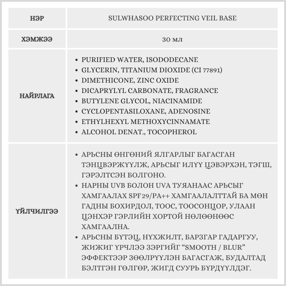 Арьсны өнгийг засаж, нүхжилт болон барзгар гадаргууг багасган жигд гөлгөр болгож арьсыг нүүр будалтад бэлтгэх үйлчилгээтэй нүүрний base. SPF29/PA++ нарны хамгаалалттай ба арьсыг гадны бохирдол, тоосонцор, инфра улаан болон цэнхэр гэрэл зэрэг гадны хортой нөлөөнөөс найдвартай хамгаална.