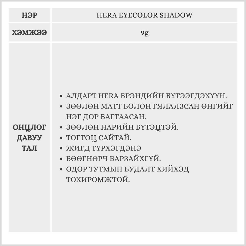 Энэхүү бүтээгдэхүүн нь алдарт HERA брэндийн зөөлөн матт болон гялалзсан өнгийг нэг дор багтаасанаараа онцлог.