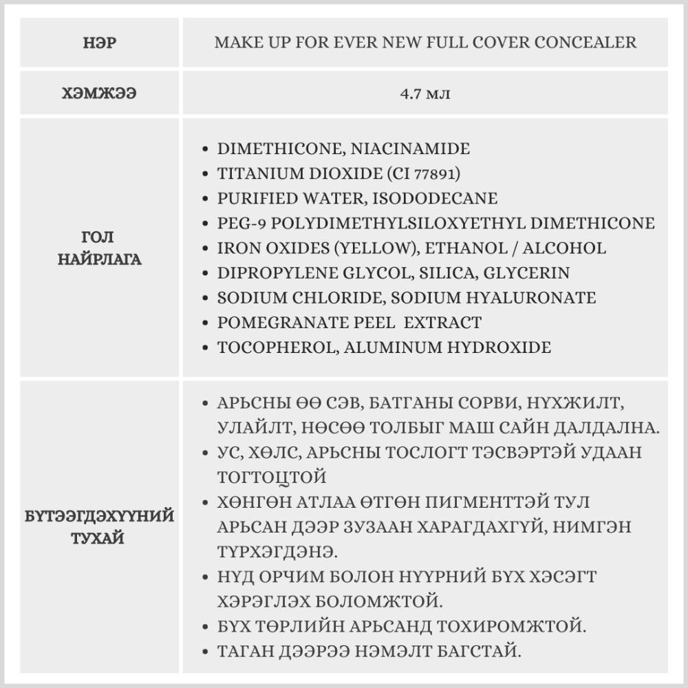 Make Up For Ever New Full Cover өө дарагч нь нүдний эргэн тойрон болон нүүрний бүх хэсэгт хэрэглэх боломжтой ба өө сэв, батганы сорви, улайлт, нүхжилт, нөсөө толбыг маш сайн дардаг усны хамгаалалттай бүтээгдэхүүн юм.