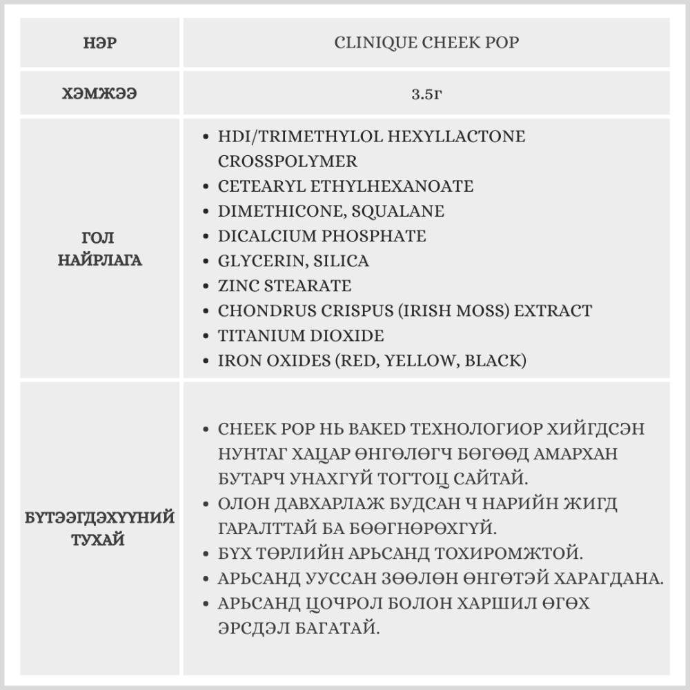 Clinique Cheek Pop нь тод гаралттай, удаан тогтоцтой хацар өнгөлөгч бүтээгдэхүүн юм. Төрөлхийн мэт уусаж харагдах бөгөөд давхарлаж түрхсэн ч бөөгнөрөхгүй ба бутарч унахгүй.