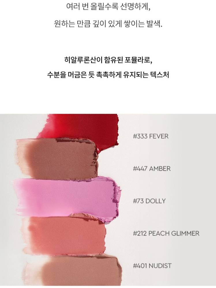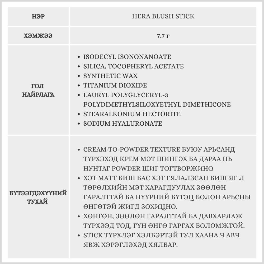 Hera брэндийн Stick түрхлэг хэлбэртэй хацар өнгөлөгч нь Cream-to-Powder Texture буюу түрхэх үед крем шиг зөөлөн шингэх ба дараа нь powder шиг хатуужиж тогтворждог бүтэцтэй бүтээгдэхүүн юм. Хэт матт болон хэт гялалзсан биш төрөлхийн мэт харагдахаар хацрыг өнгөлнө.