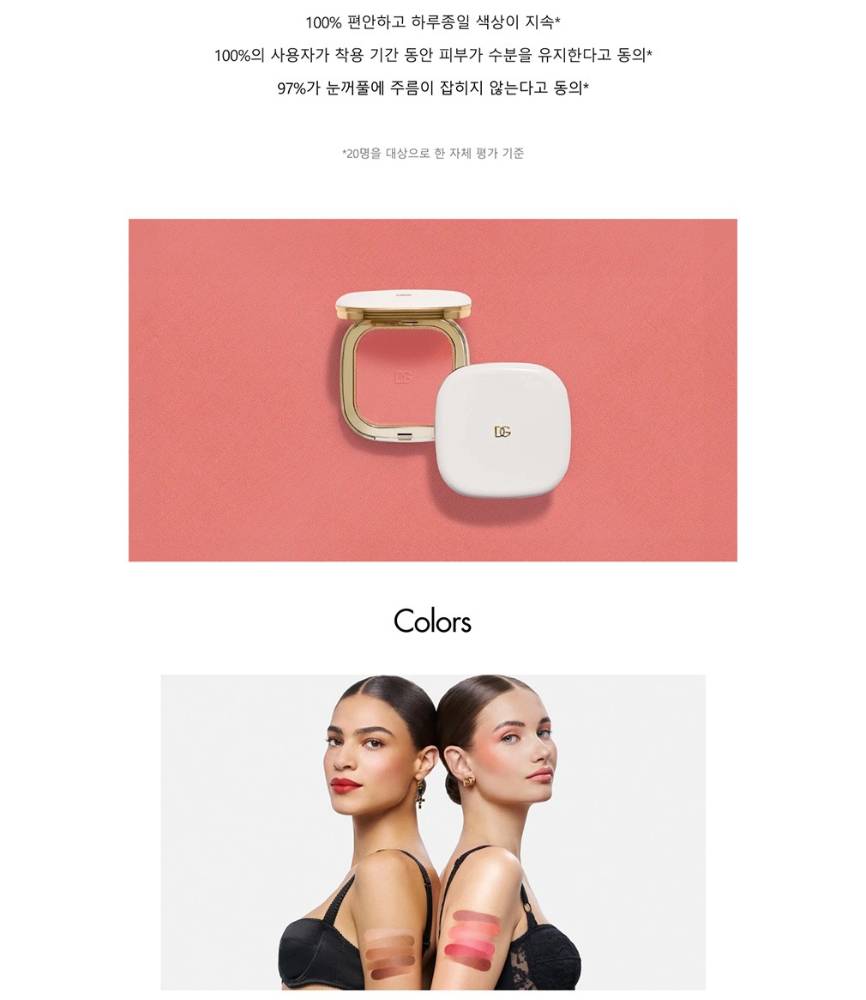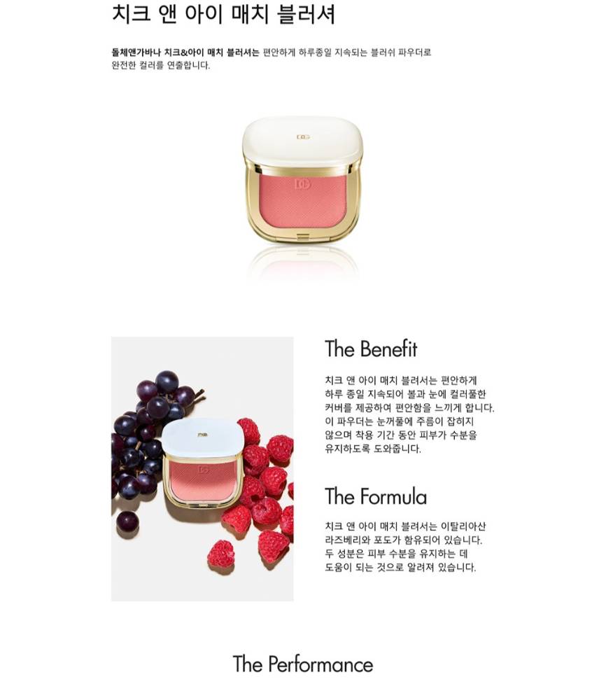 Dolce & Gabbana брэндийн хацар өнгөлөгч нь Cheeks & Eyes Match буюу хацар болон нүдэндээ аль алинд нь хэрэглэж болох нүүр, хацар, нүдийг нэг өнгөөр жигд зохицсон эффекттэй харагдуулах онцлогтой. Давхар арьсыг чийгшүүлж, зөөлрүүлэн чийгийг удаан хадгална.