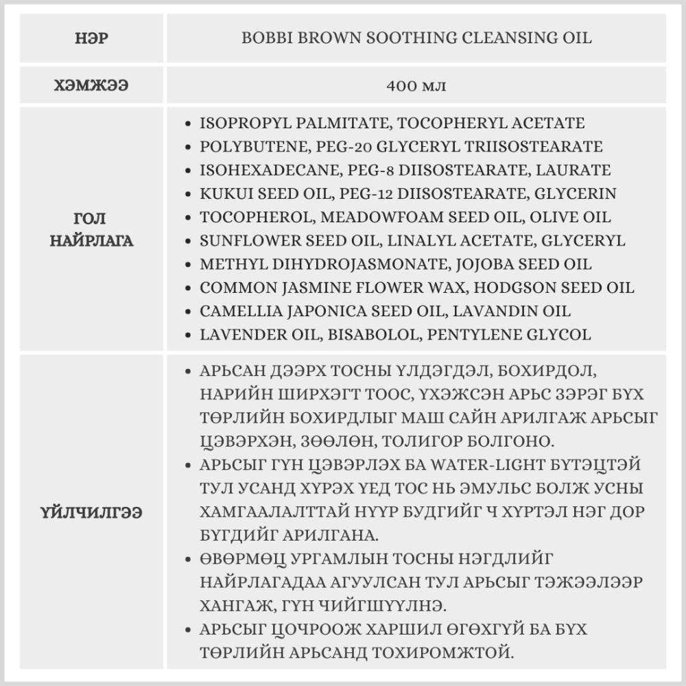 BOBBI BROWNBobbi Brown Soothing тосон цэвэрлэгч нь арьсыг гүн цэвэрлэх болон чийгшүүлж, тэжээл өгөх үйлчилгээ хослуулсан дээд зэрэглэлийн бүтээгдэхүүн юм. Water-light бүтэцтэй тул усны хамгаалалттай нүүрний будгийг ч хормын төдийд арилгаж, арьсыг цэвэрхэн толигор болгоно.