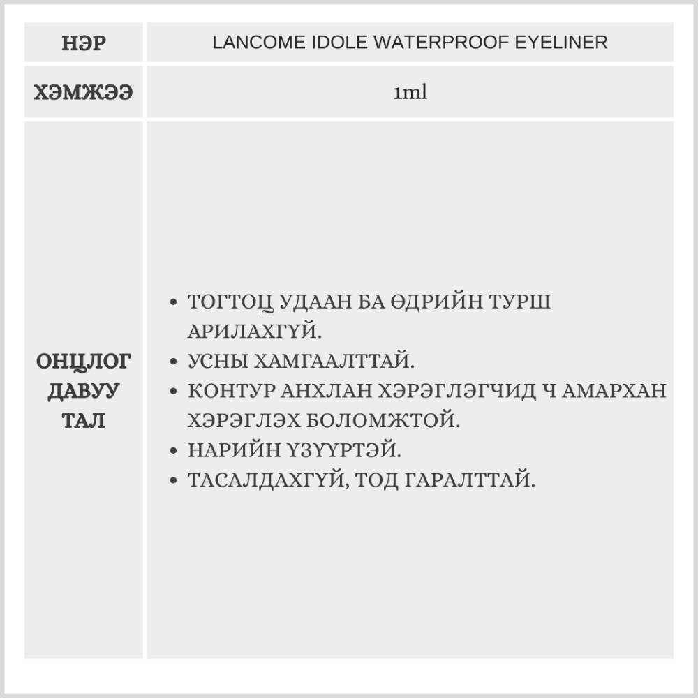 Энэхүү бүтээгдэхүүн нь удаан тогтоцтой бөгөөд өдрийн турш арилгахгүй, усны хамгаалалттайгаараа онцлог.