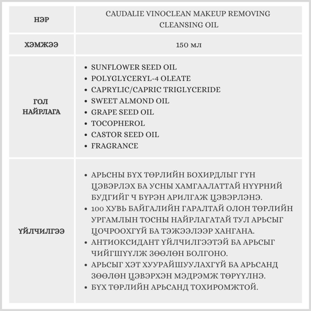 Caudalie Vinoclean Makeup Removing Cleansing Oil тосон цэвэрлэгч нь арьсны бүх төрлийн бохирдлыг гүн цэвэрлэх ба усны хамгаалалттай нүүрний будгийг ч бүрэн арилгах антиоксидант үйлчилгээтэй бүтээгдэхүүн юм.