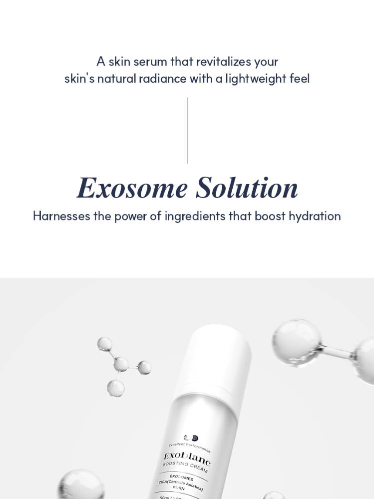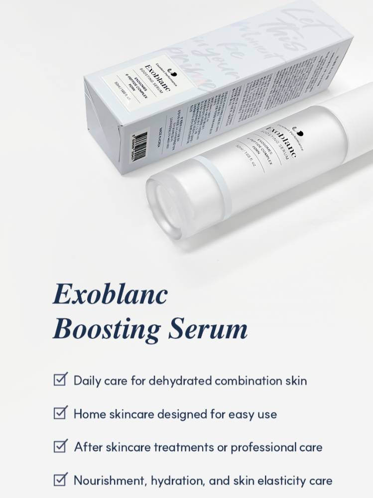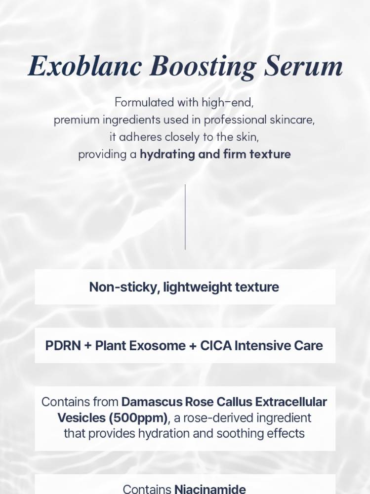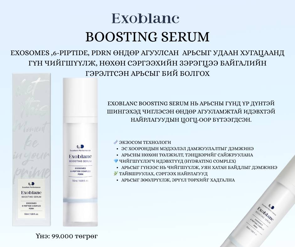 Exosomes ,6-piptide, pdrn өндөр агуулсан Арьсыг удаан хугацаанд гүн чийгшүүлж, нөхөн сэргээхийн зэрэгцээ байгалийн гэрэлтсэн арьсыг бий болгоно. Exoblanc Boosting Serum нь арьсны гүнд үр дүнтэй шингэхэд чиглэсэн өндөр агууламжтай идэвхтэй найрлагуудын цогц-оор бүтээгдсэн.