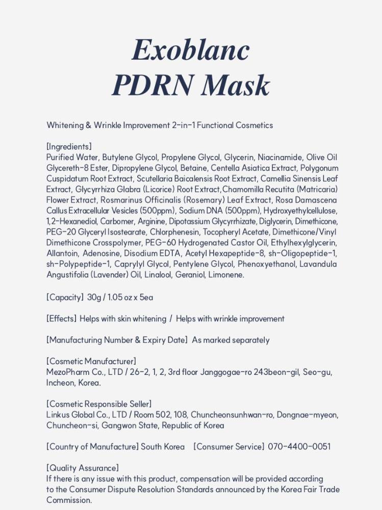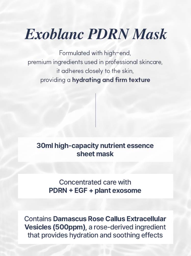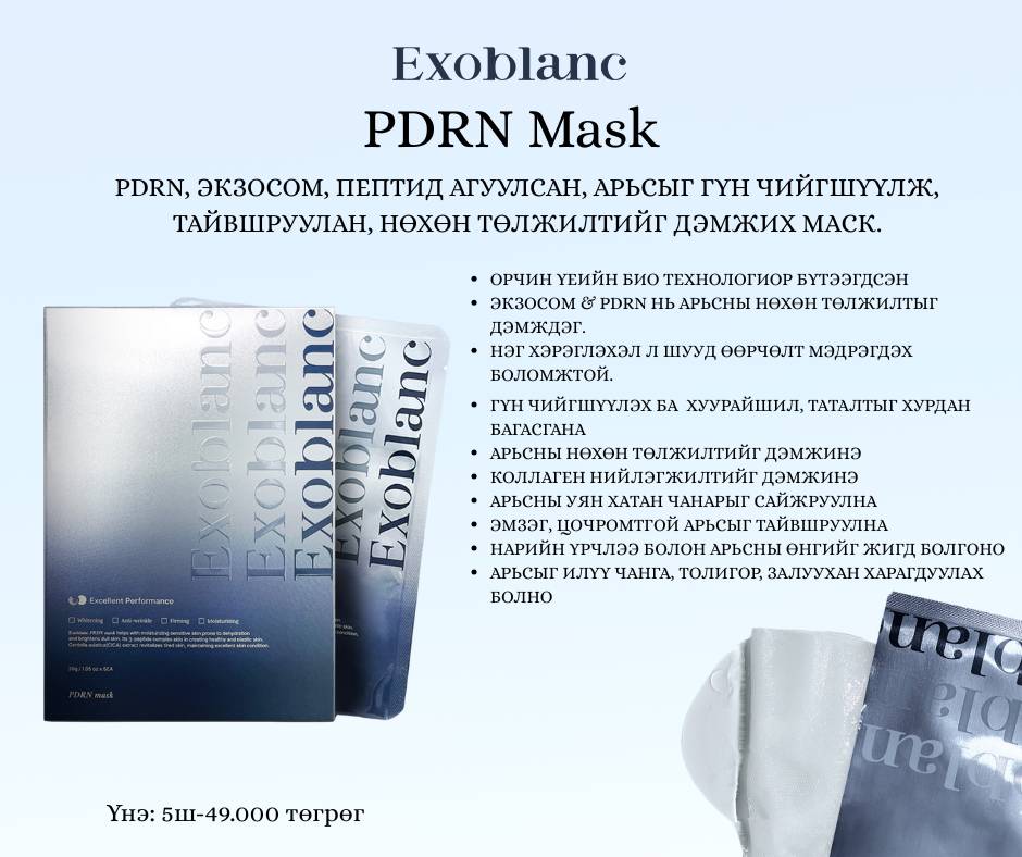 PDRN, экзосом, пептид агуулсан, арьсыг гүн чийгшүүлж, тайвшруулан, нөхөн төлжилтийг дэмжих маск. Орчин үеийн био технологиор бүтээгдсэн Экзосом & PDRN нь арьсны нөхөн төлжилтыг дэмждэг. Нэг хэрэглэхэл л шууд өөрчөлт мэдрэгдэх боломжтой.