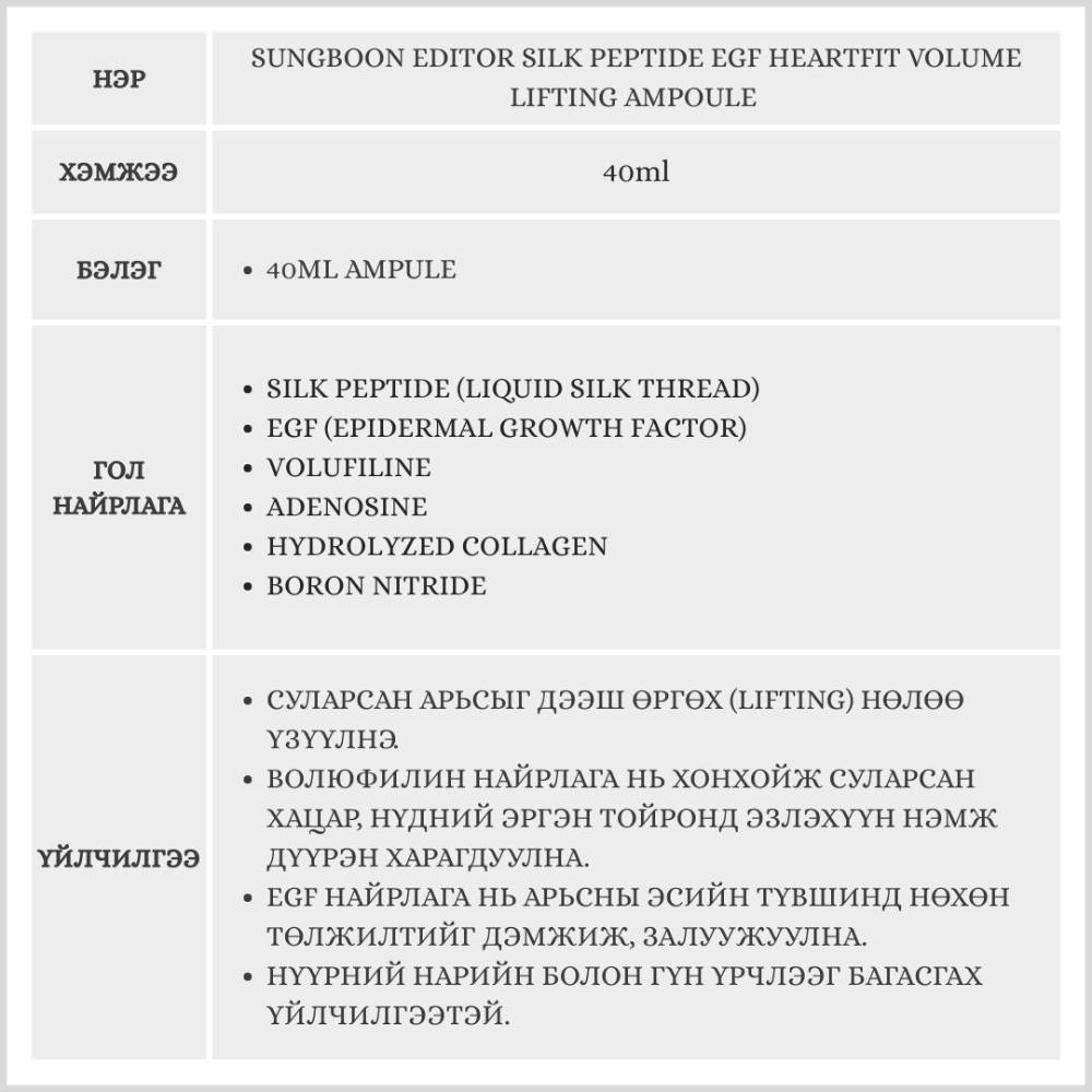Арьсны уян хатан чанарыг сайжруулж, суларч унжсан хэсгүүдийг өргөх зориулалттай ампуль юм. Бэлгэнд 40мл-тэй ампуль дагалдана.