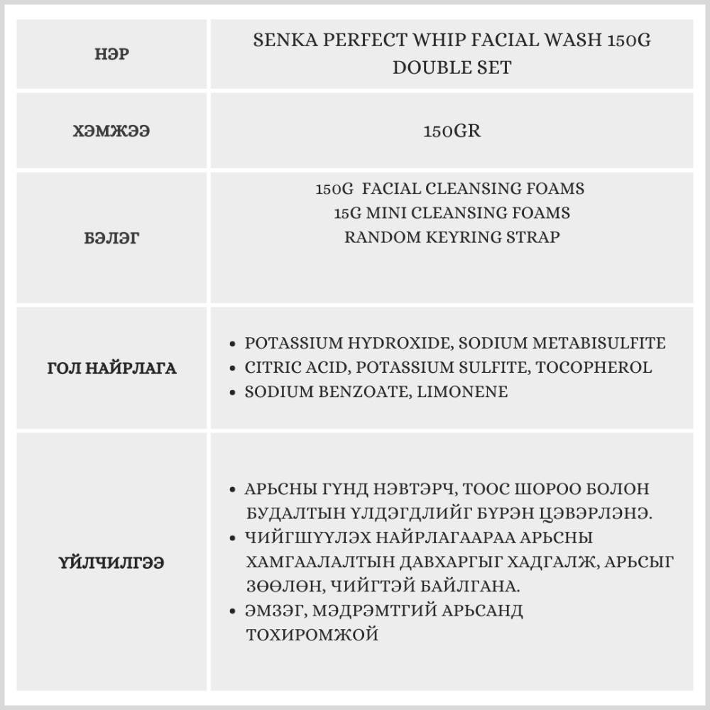 Арьсны гүнд нэвтэрч, тоос шороо болон будалтын үлдэгдлийг бүрэн цэвэрлэнэ.Чийгшүүлэх найрлагаараа арьсны хамгаалалтын давхаргыг хадгалж, арьсыг зөөлөн, чийгтэй байлгана. 150 г-ийн нүүр угаагч хөөс 2 ширхэг + 15 г мини хэмжээтэй 1 ширхэг, мөн түлхүүрийн оосор дагалдана.