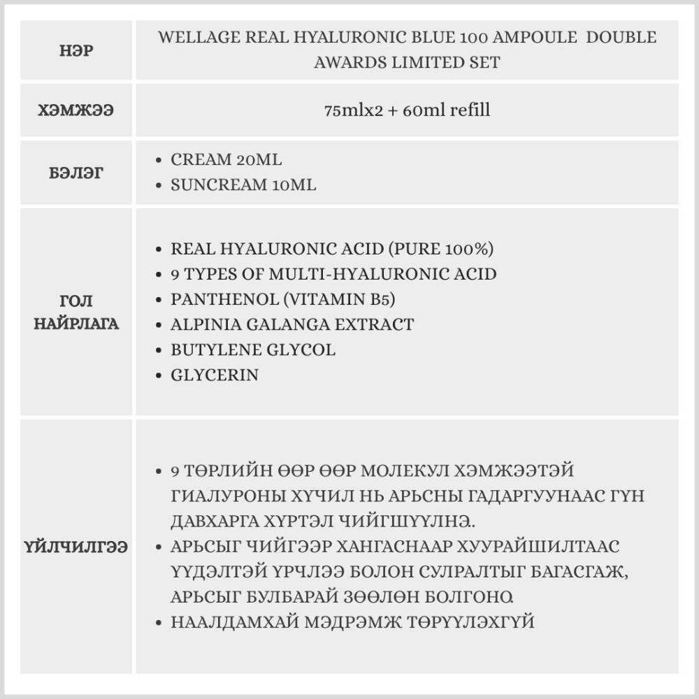 Энэхүү бүтээгдэхүүн нь арьсны гүний чийгшлийг нөхөх, чийг хадгалах чадварыг сайжруулах ампул юм. Бэлгэнд нүүрний тос 20мл, нарны тос 10мл дагалдана.