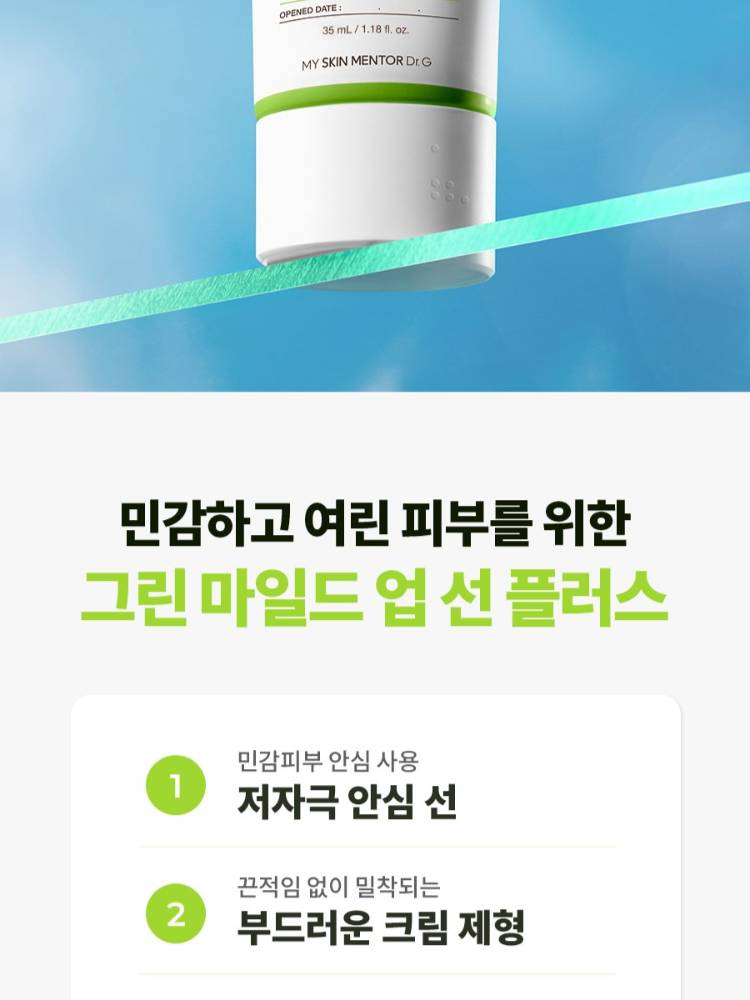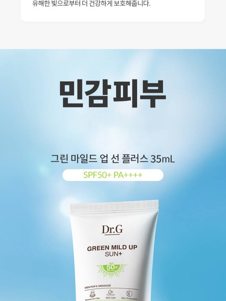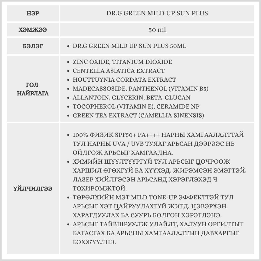 Эмзэг арьсанд зориулагдсан, цочрол өгөхгүй, 100% физик хамгаалалттай нарны тос. Хөнгөн mild tone-up эффекттэй тул арьсны өнгийг жигдэлж, гэрэлтсэн толигор харагдуулна. Бэлгэнд үндсэн бүтээгдэхүүнээс гадна Dr.G Green Mild Up Sun Plus 20мл нарны тос дагалдана.