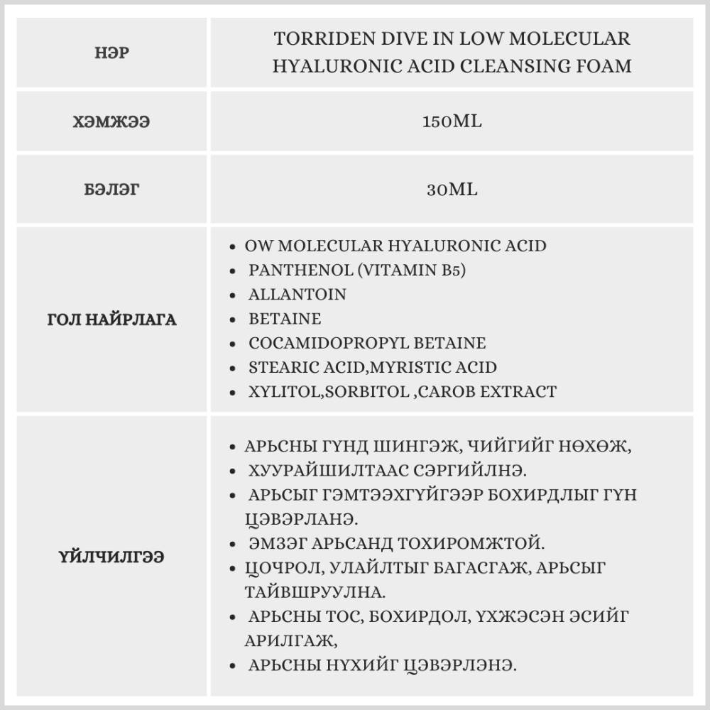Арьсны гүнд шингэж, чийгийг нөхөж, хуурайшилтаас сэргийлнэ. Эмзэг арьсанд тохиромжтой, арьсыг тайвшруулна. Арьсны тос, бохирдол, үхэжсэн эсийг арилгаж, арьсны нүх сүвийг цэвэрлэнэ. PH 5.5-тэнцвэртэй, өдөр тутмын хэрэглээнд тохиромжтой.