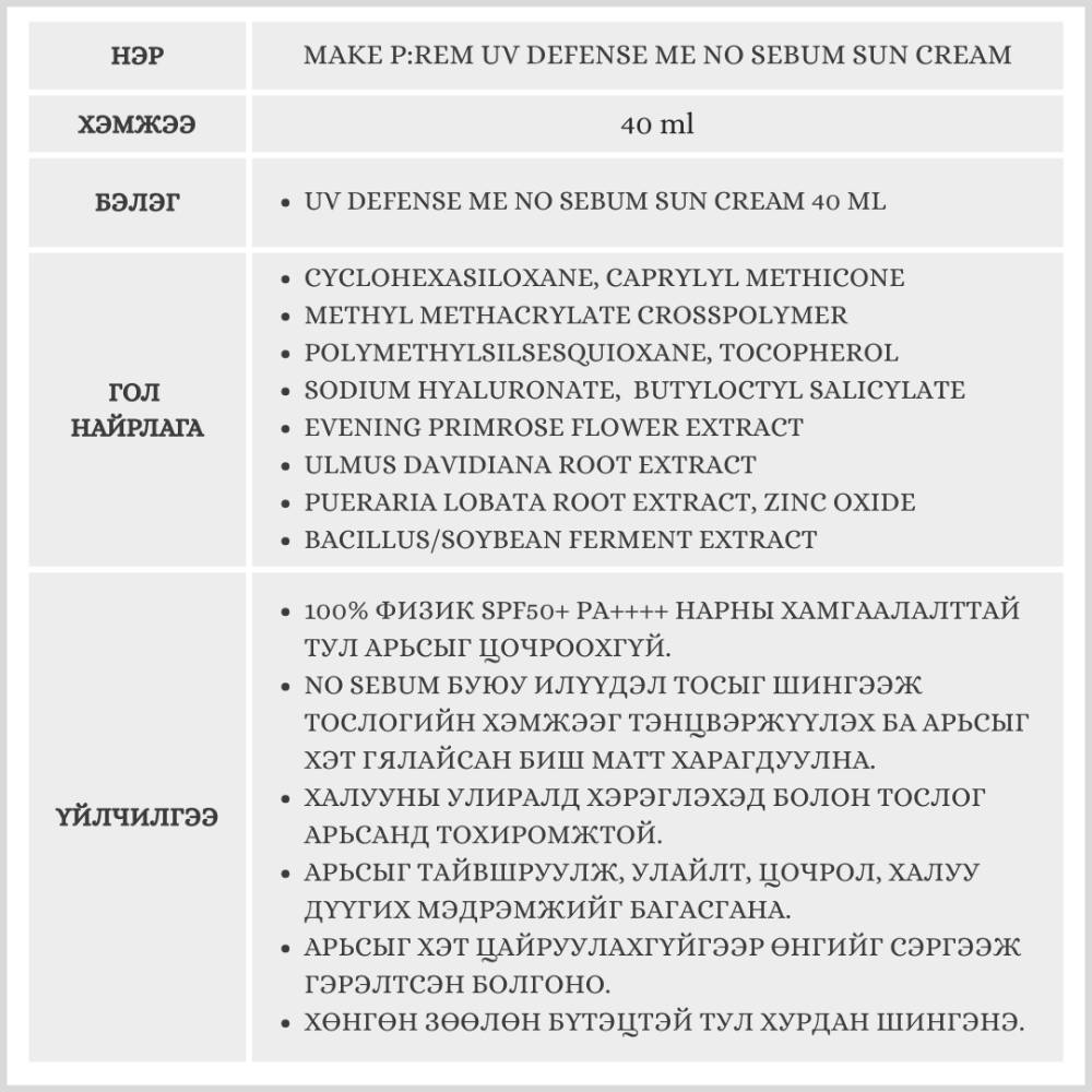 Эмзэг арьсанд зориулсан 100% физик шүүлтүүртэй нарны тос. Нарны хэт ягаан туяанаас арьсыг найдвартай хамгаалахаас гадна арьсны тослогийг тэнцвэржүүлж, арьсыг матт харагдуулах үйлчилгээтэй. Үндсэн бүтээгдэхүүнээс гадна бэлгэнд UV Defense Me No Sebum 40мл нарны тос дагалдана.