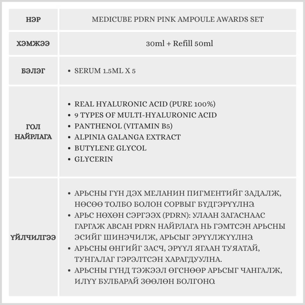 Арьсны өнгийг цайруулах, нөсөө толбыг бүдгэрүүлэх болон арьсыг нөхөн сэргээх PDRN төрлийн ампуль юм. Бэлгэнд 50мл ампуль болон 1,5мл-тэй жижиг 5 ширхэг ампуль дагалдана.