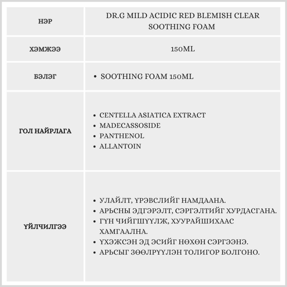 Арьсыг тайвшруулж, улайлт болон үрэвслийг бууруулна.Арьсны pH ийн тэнцвэрийг хадгална.Эд эсийг сэргээн чийгшүүлэх үйлчилгээтэй.Эмзэг, батгашилттай арьсанд тохиромжтой. 150 мл-ийн cleansing foam бэлгэнд дагалдана.