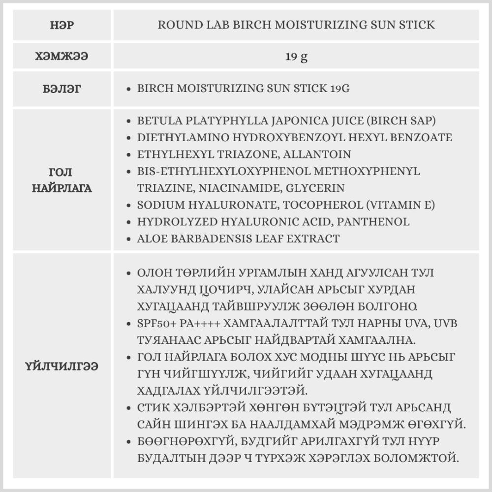 Найрлагадаа хус модны шүүс агуулсан арьсыг гүн чийгшүүлэх үйлчилгээтэй нарны стик. Арьсыг нарны хэт ягаан туяанаас найдвартай хамгаалахаас гадна халуунд цочирсон арьсыг тайвшруулна. Бэлгэнд үндсэн бүтээгдэхүүнээс гадна Lab Birch Moisturizing 19г нарны стик дагалдана.